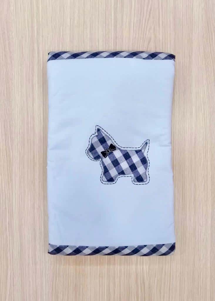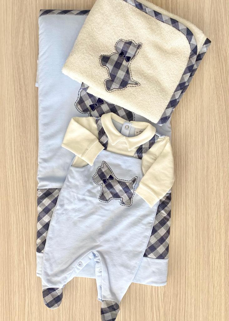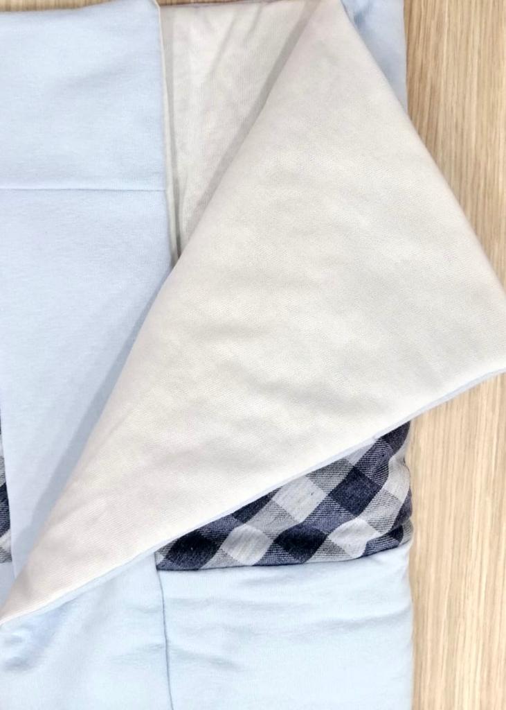 Copertina neonato, in caldo cotone e morbidissima imbottitura, di colore azzurro e con dettagli di colore blu.