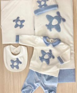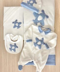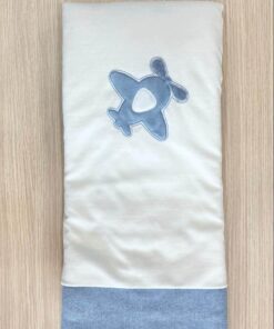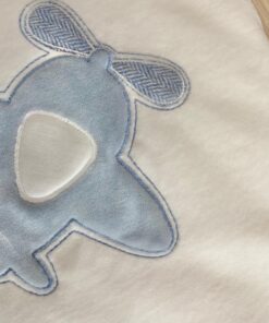 Copertina neonato in morbida ciniglia di cotone, di colore panna e celeste, con disegno in rilievo.