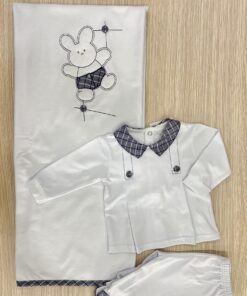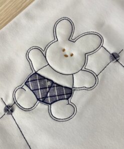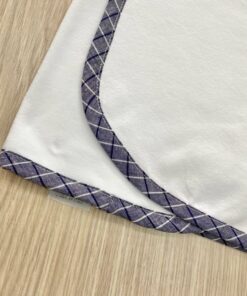 Copertina neonato in cotone, di colore bianco e blu con ricamo in rilievo e applicazione di bottoncino.