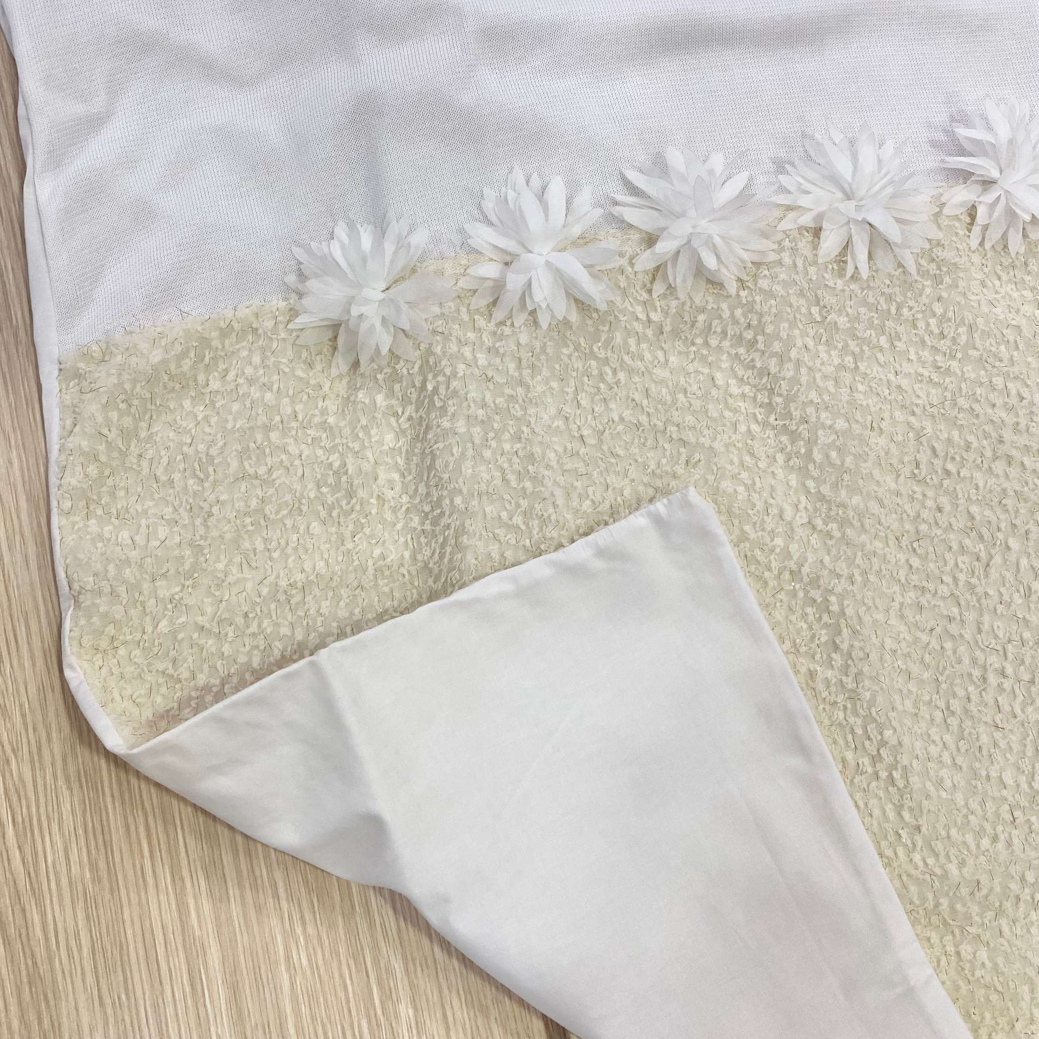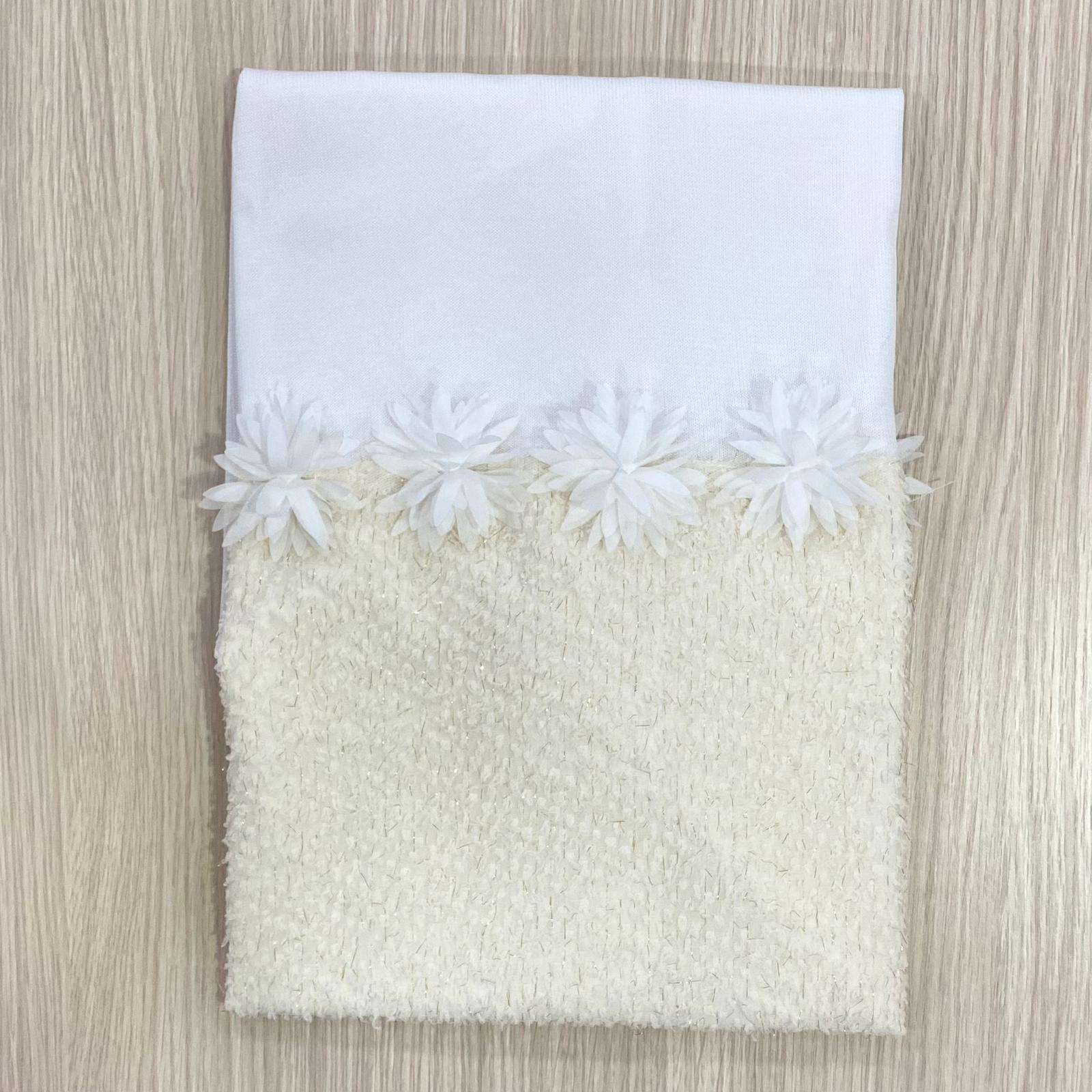 Copertina neonata in filo di scozia, di colore panne e beige, con applicazione di fiorellini, e dettagli in lurex di cotone.