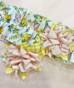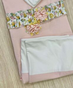 Copertina neonata in cotone, di colore rosa e panna, con dettagli floreali di vari colori e applicazione di fiorellini in tessuto.