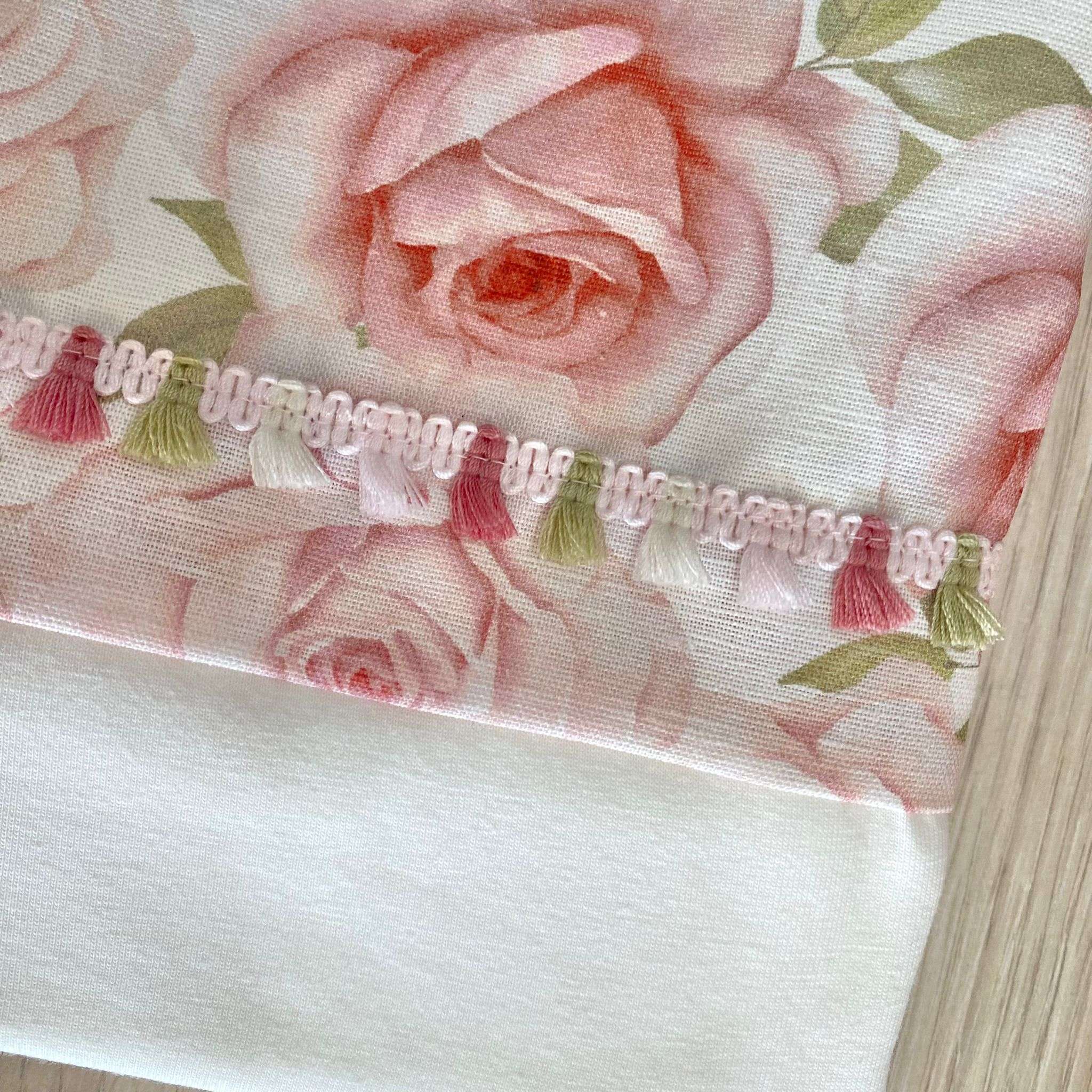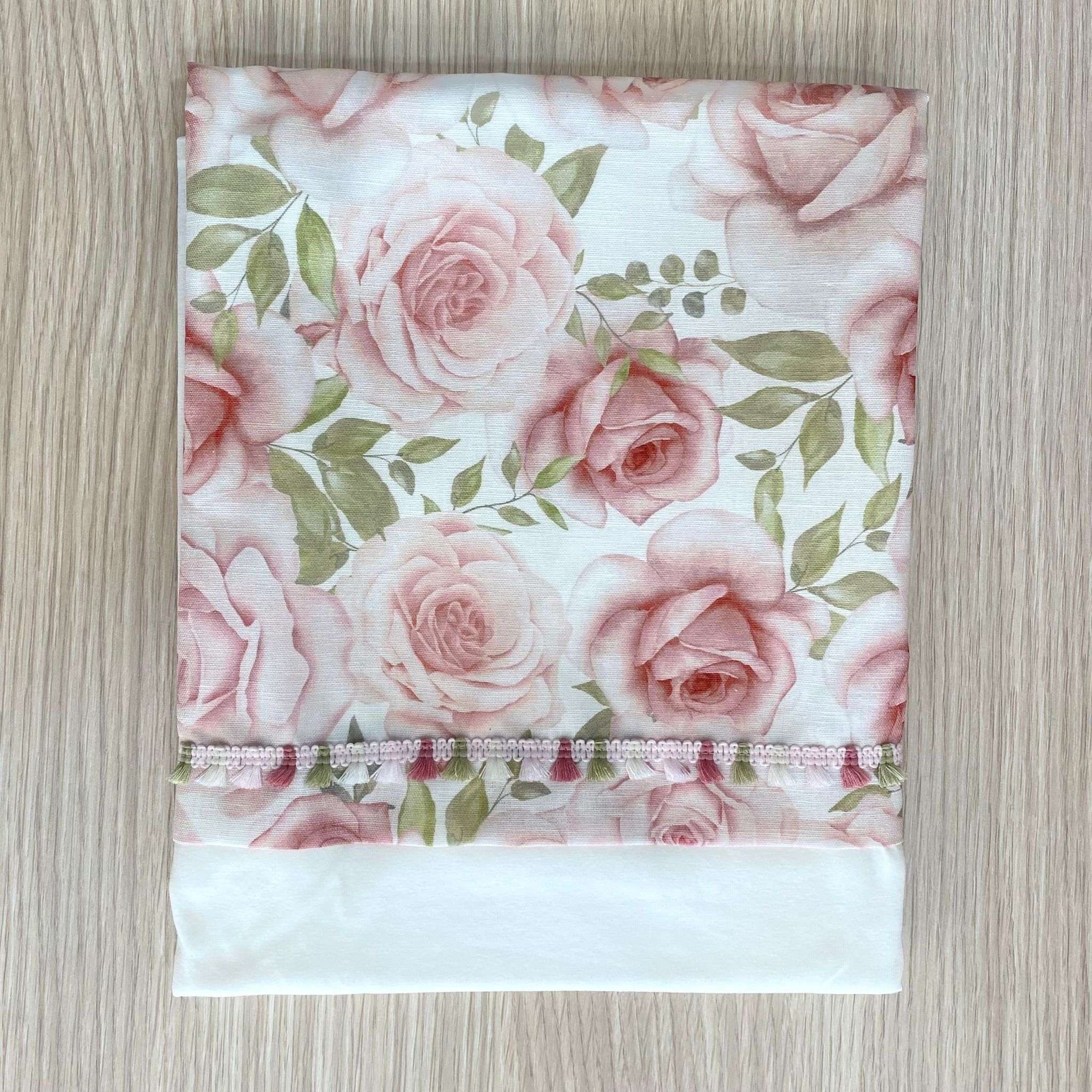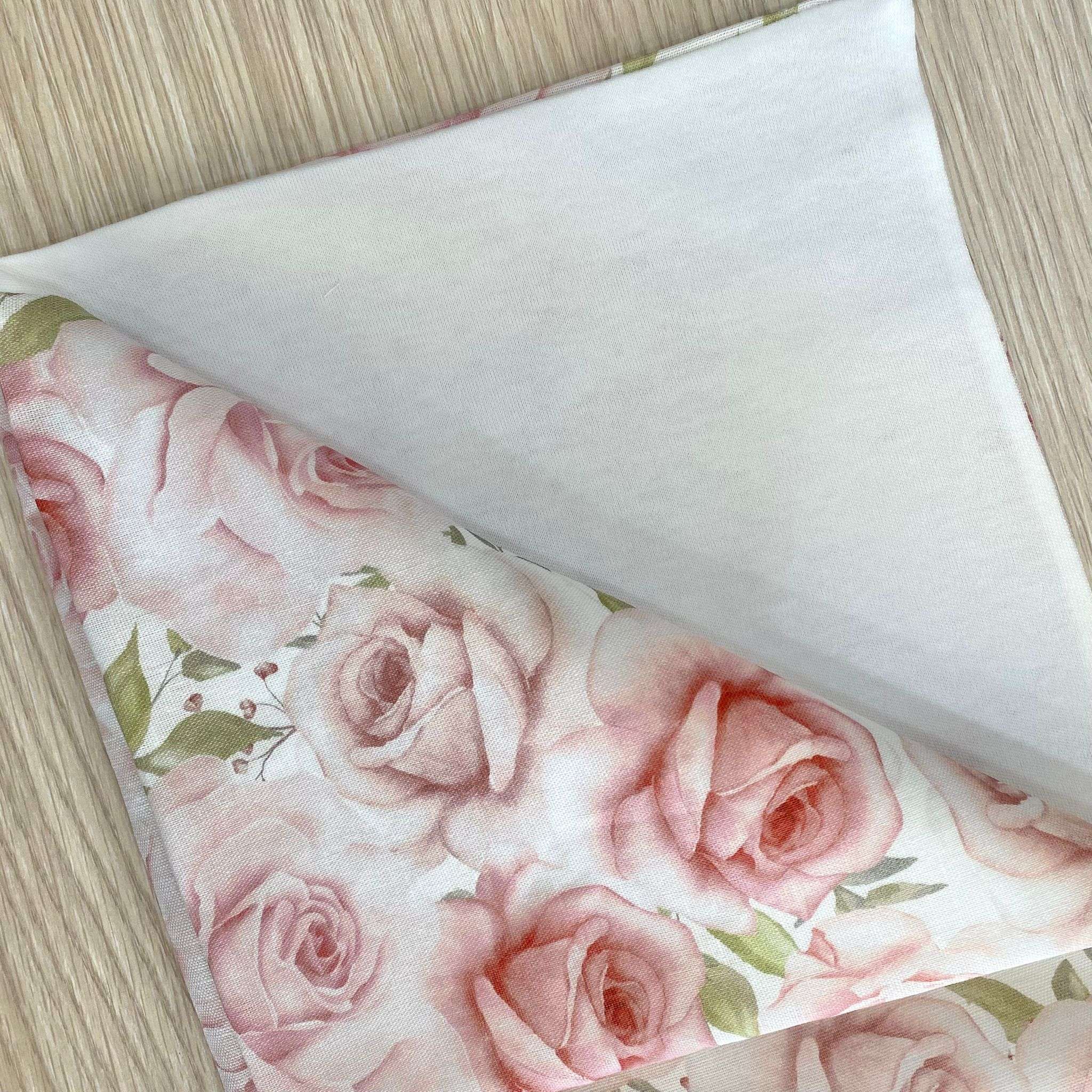 Copertina neonata in cotone misto lino, di colore panna e rosa, con disegno di rose.