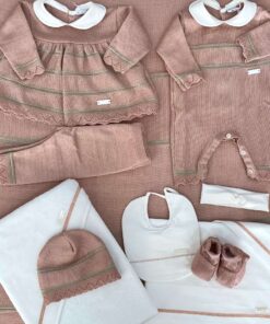 Copertina neonata in filo di scozia, di colore cinnamon, verde e panna, con applicazione di logo.