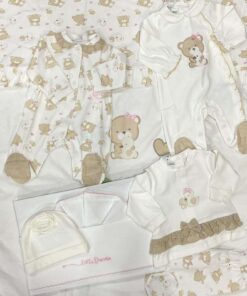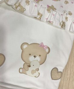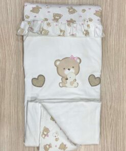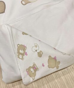 Copertina neonata in cotone, di colore panna e beige, con disegno ricamato, dettaglio di applicazione fiocchetto rosa.