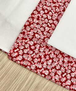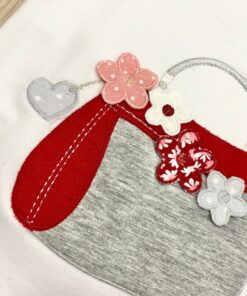 Copertina neonata culla/carrozzina in cotone di colore bianco e grigio applicazioni in rilievo e di colore rosso, con bordo a stampa floreale.