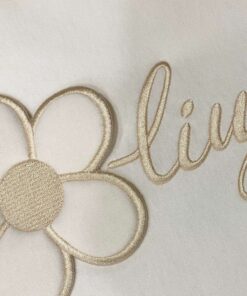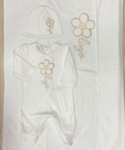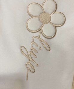 Copertina neonata in cotone, di colore bianco latte, con dettaglio di ricamo beige, con applicazione in rilievo di margherita.