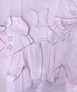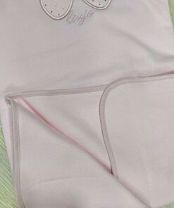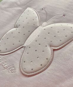 Copertina neonata in cotone, di colore rosa, con applicazione in rilievo di farfalla in tessuto e strass.