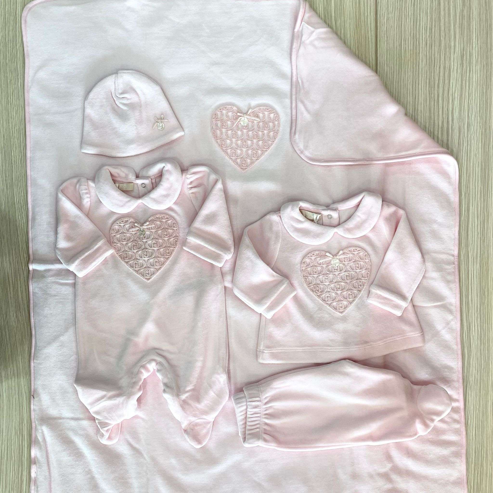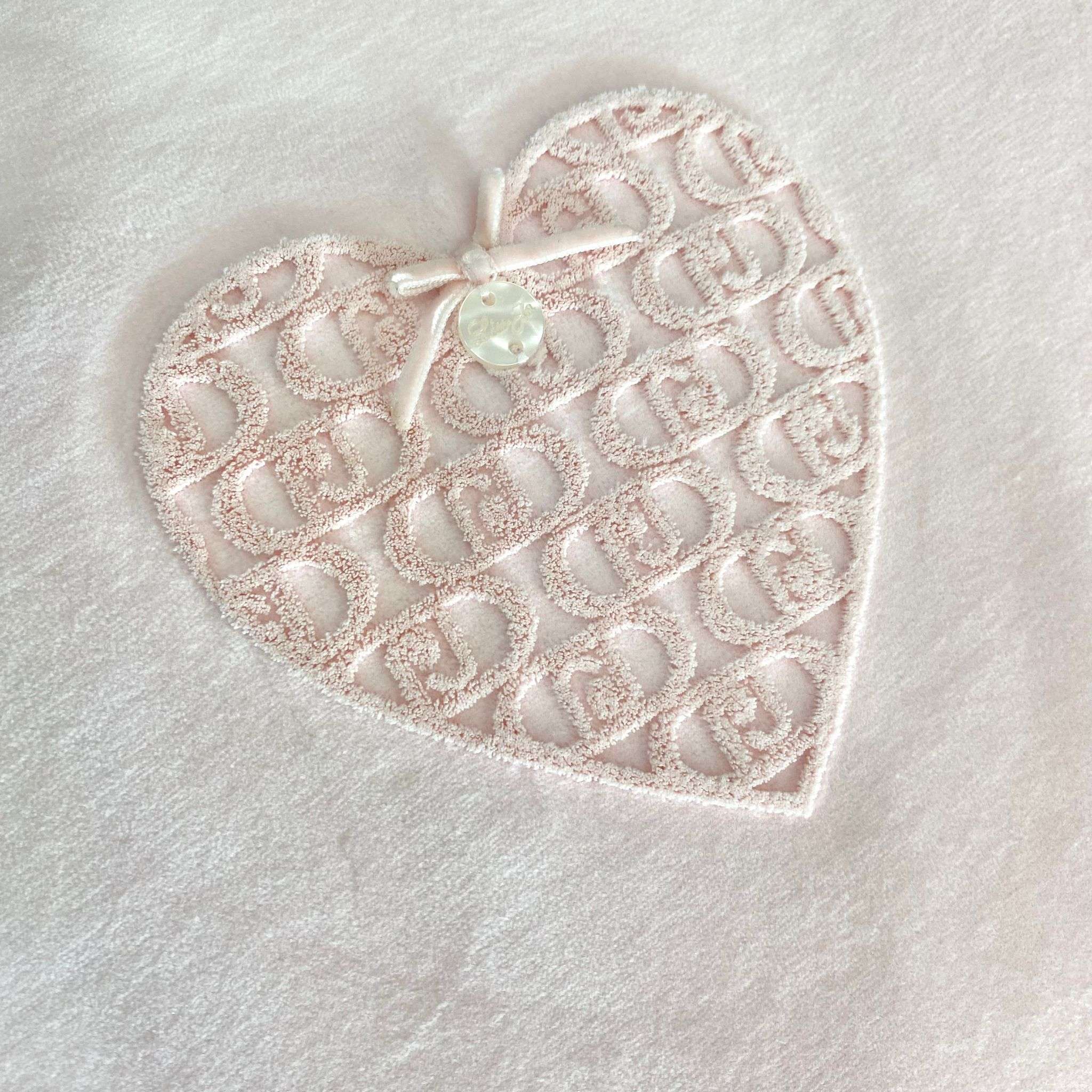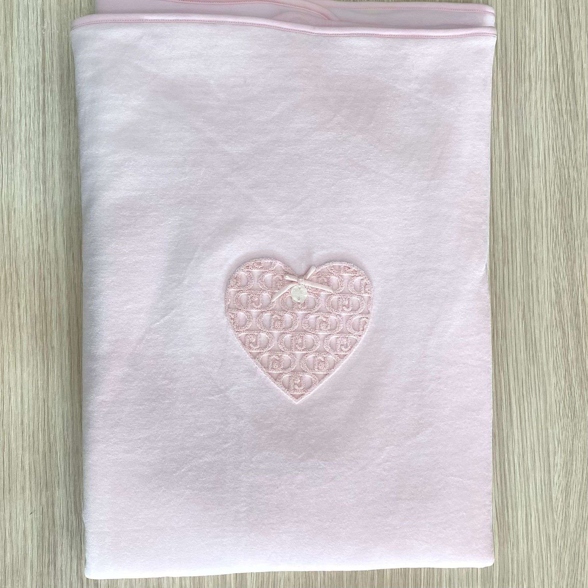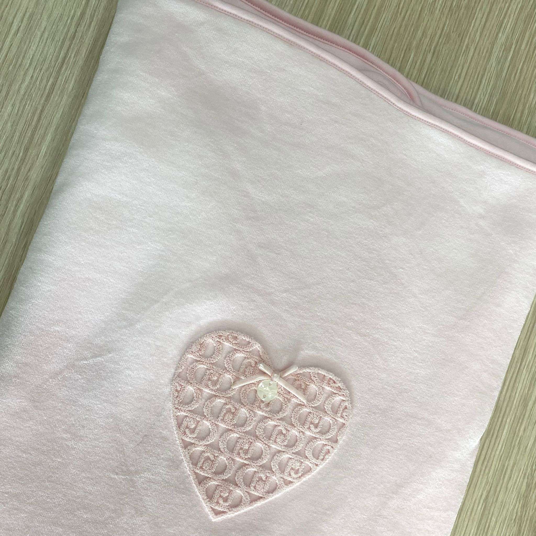 Copertina neonata in ciniglia, di colore rosa, con dettaglio di cuoricino con logo LIU•JO in rilievo e applicazione di fiocchetto.