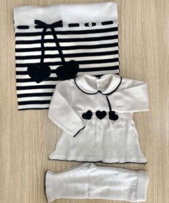 Copertina neonata in filo, di colore bianco e blu, con dettaglio di cuoricini in rilievo