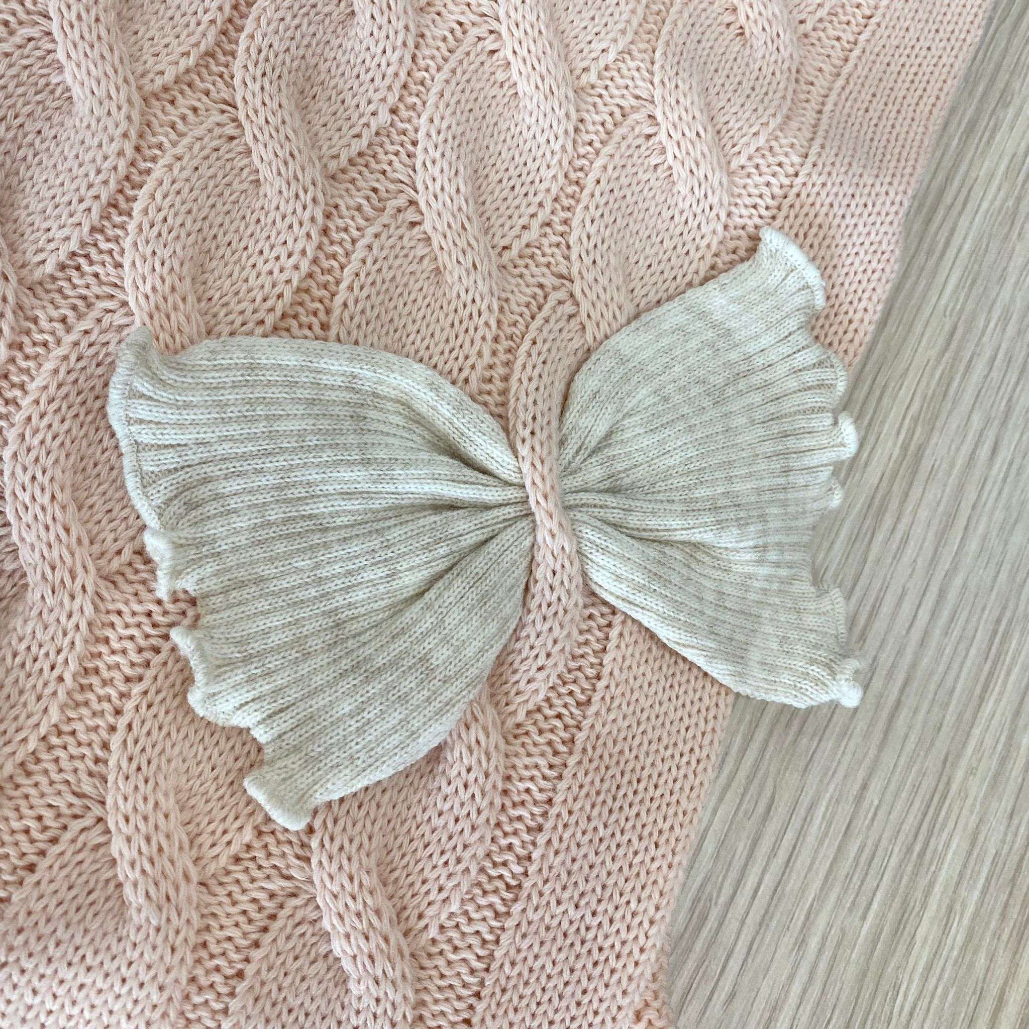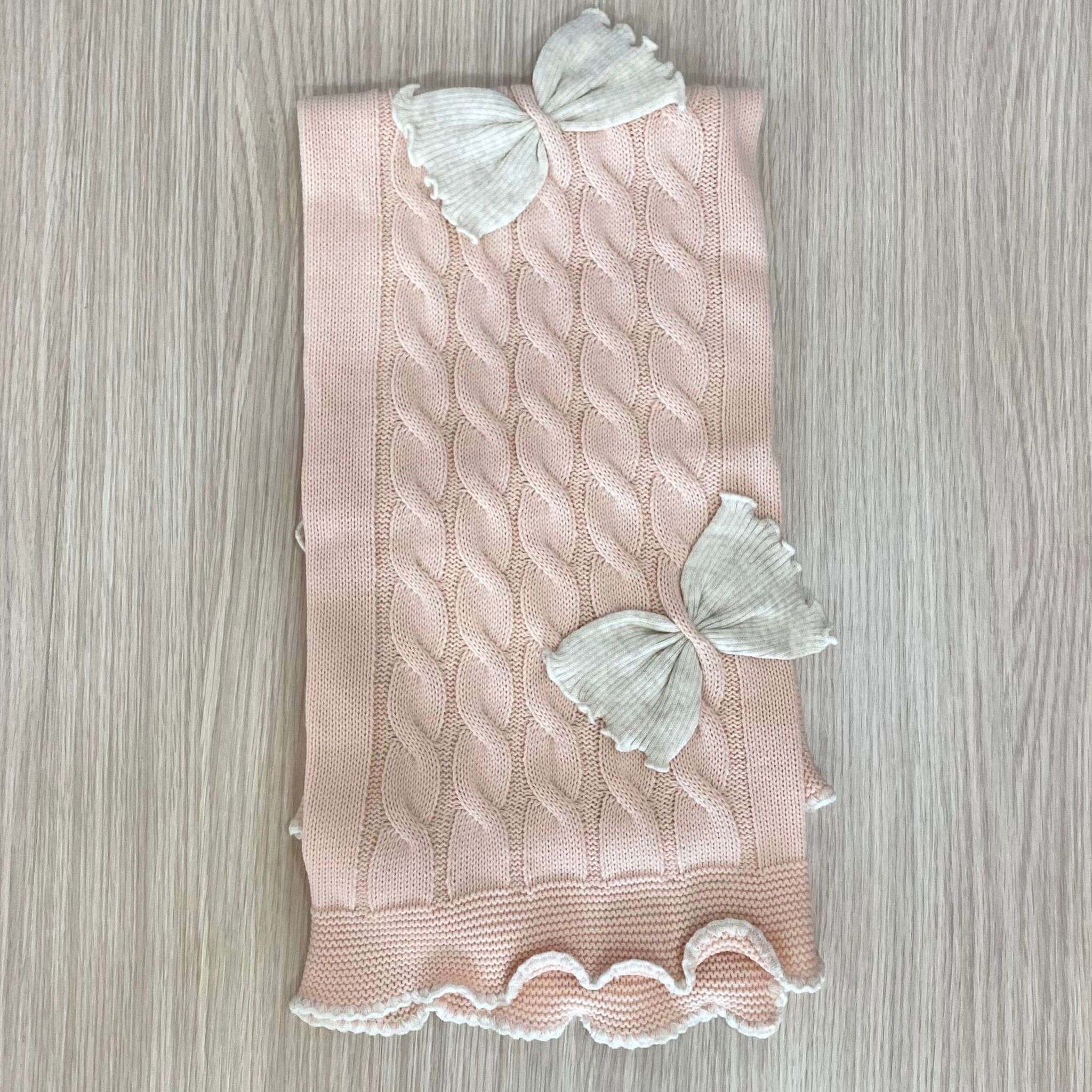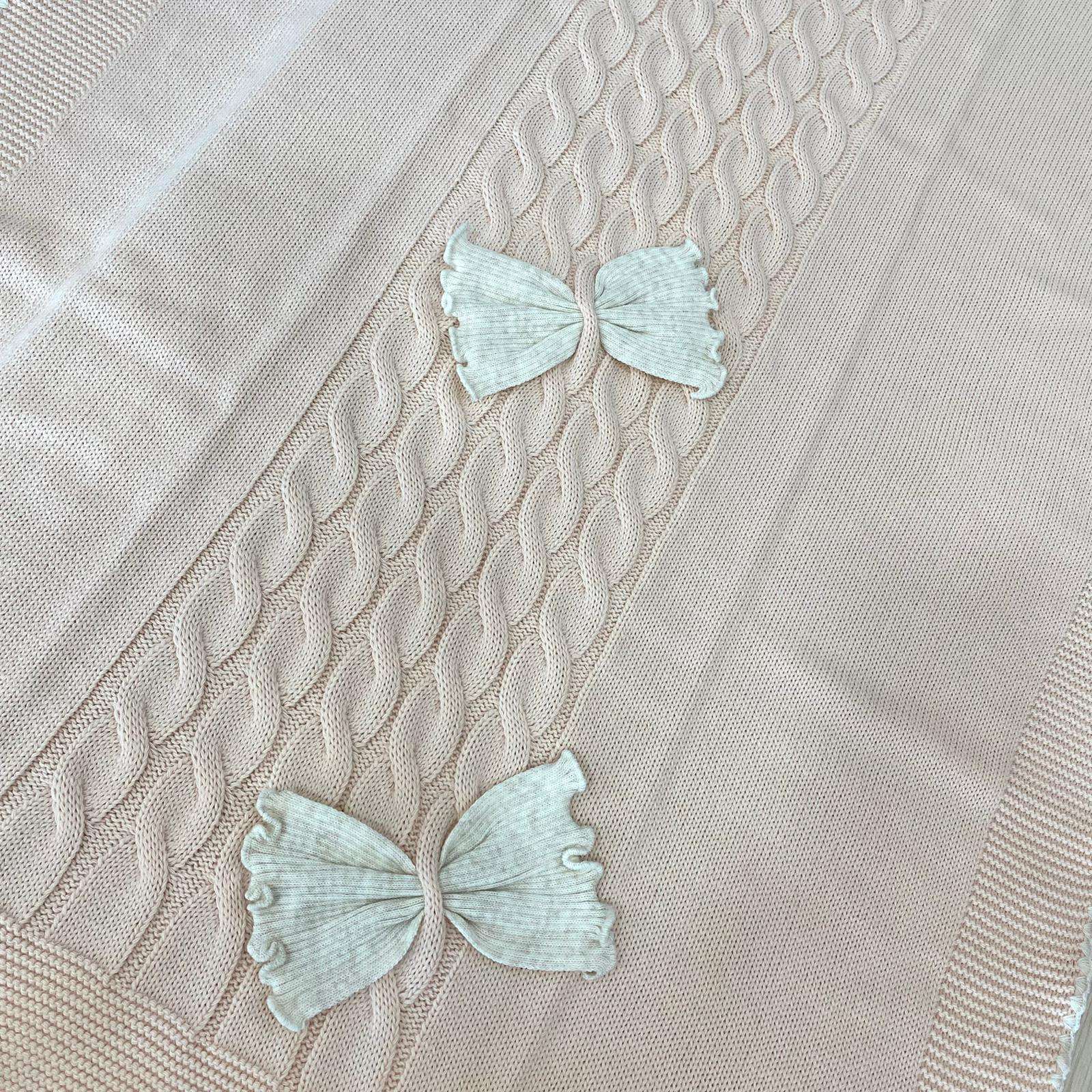Copertina neonata in lana, di colore cipria e beige, con applicazione di fiocchi in tessuto.