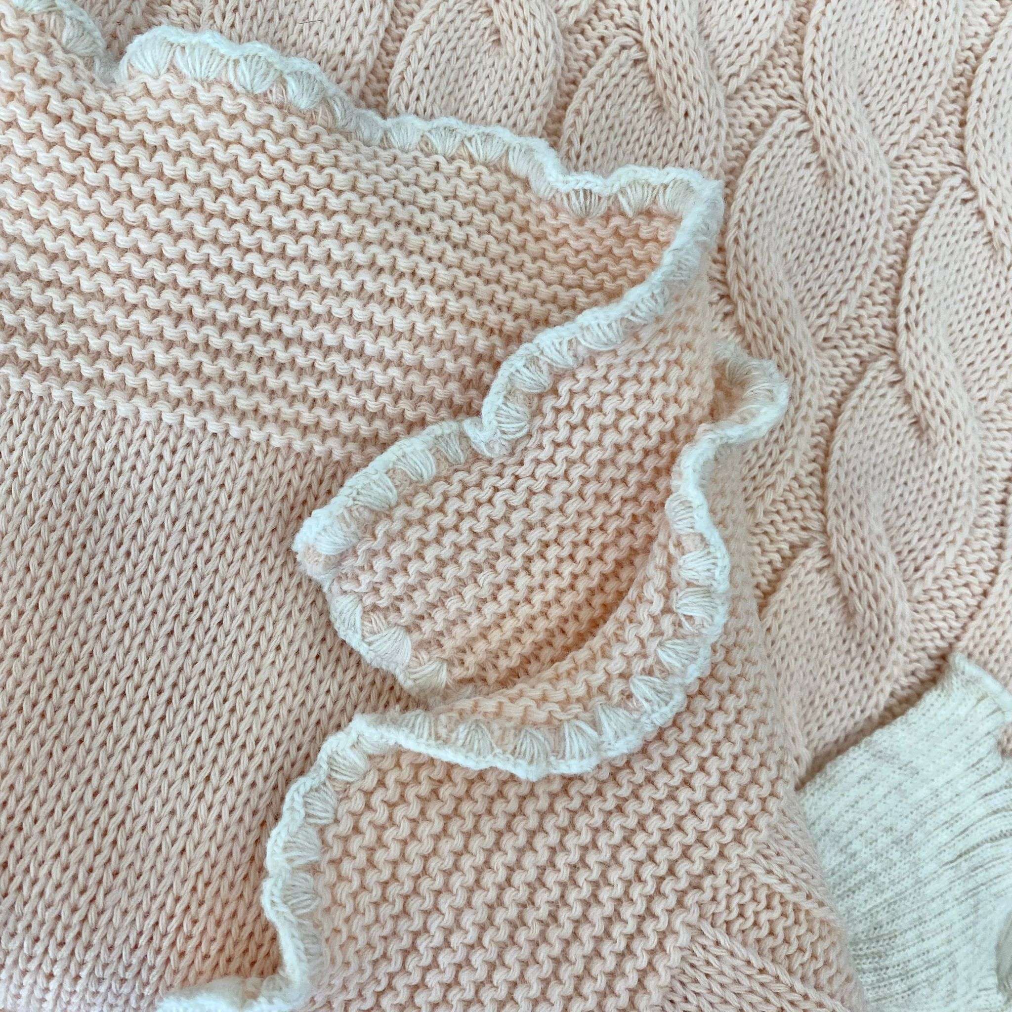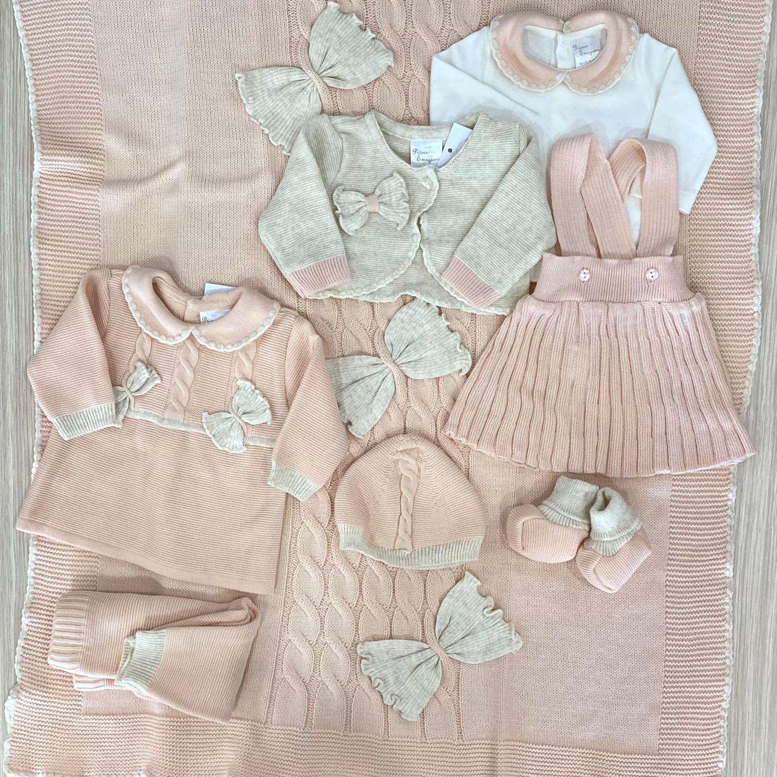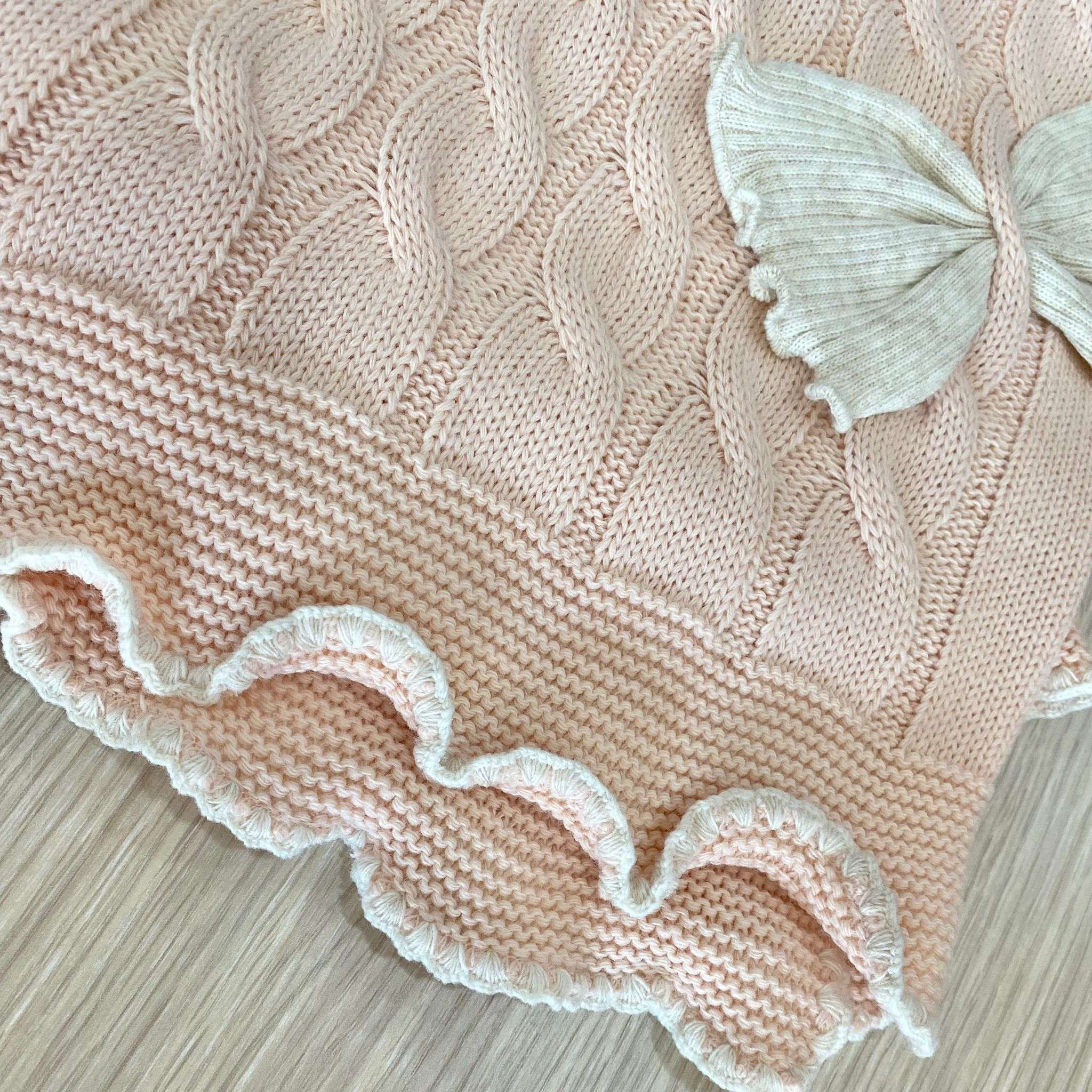 Copertina neonata in lana, di colore cipria e beige, con applicazione di fiocchi in tessuto.