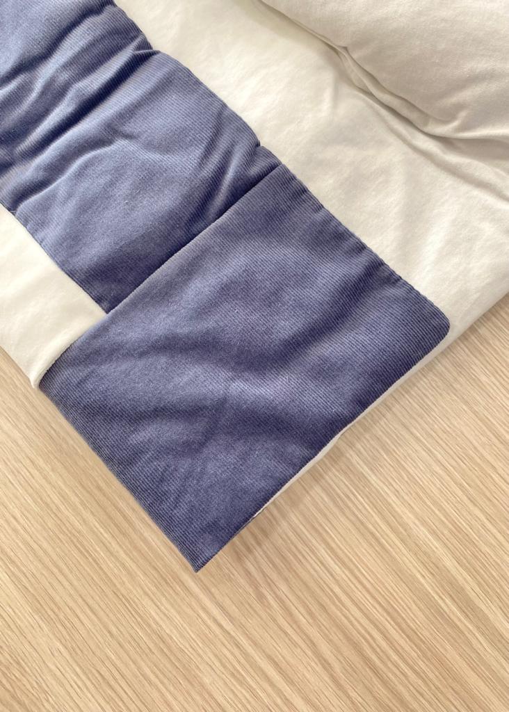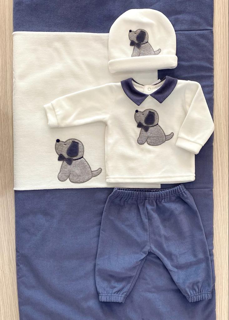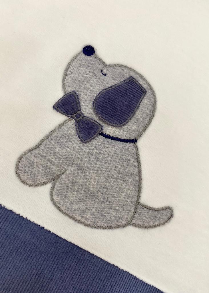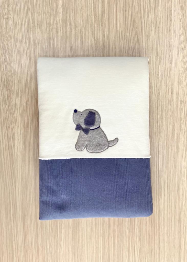 Copertina neonato in morbida ciniglia di cotone e velluto, di colore panna e jeans con disegno ricamato in rilievo.