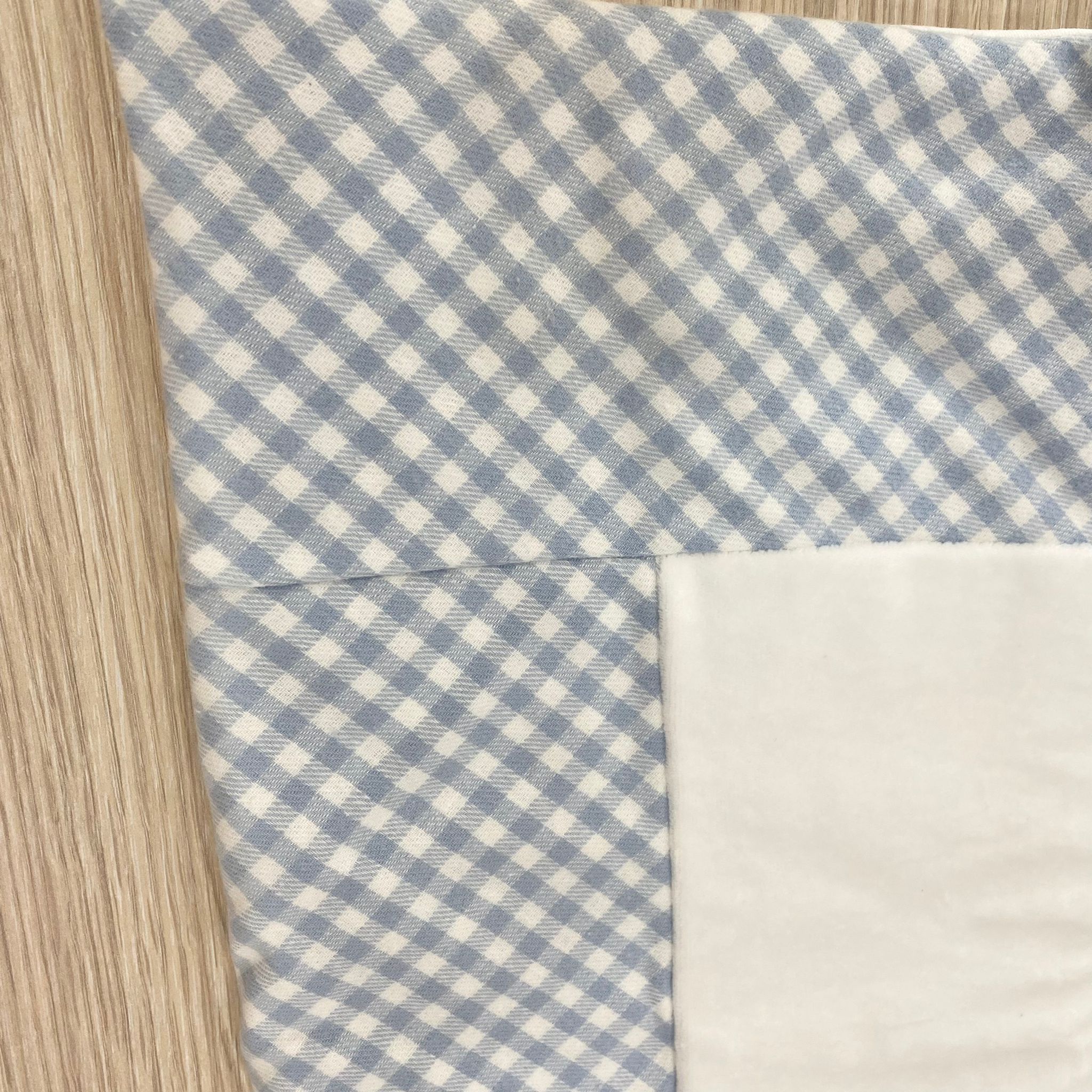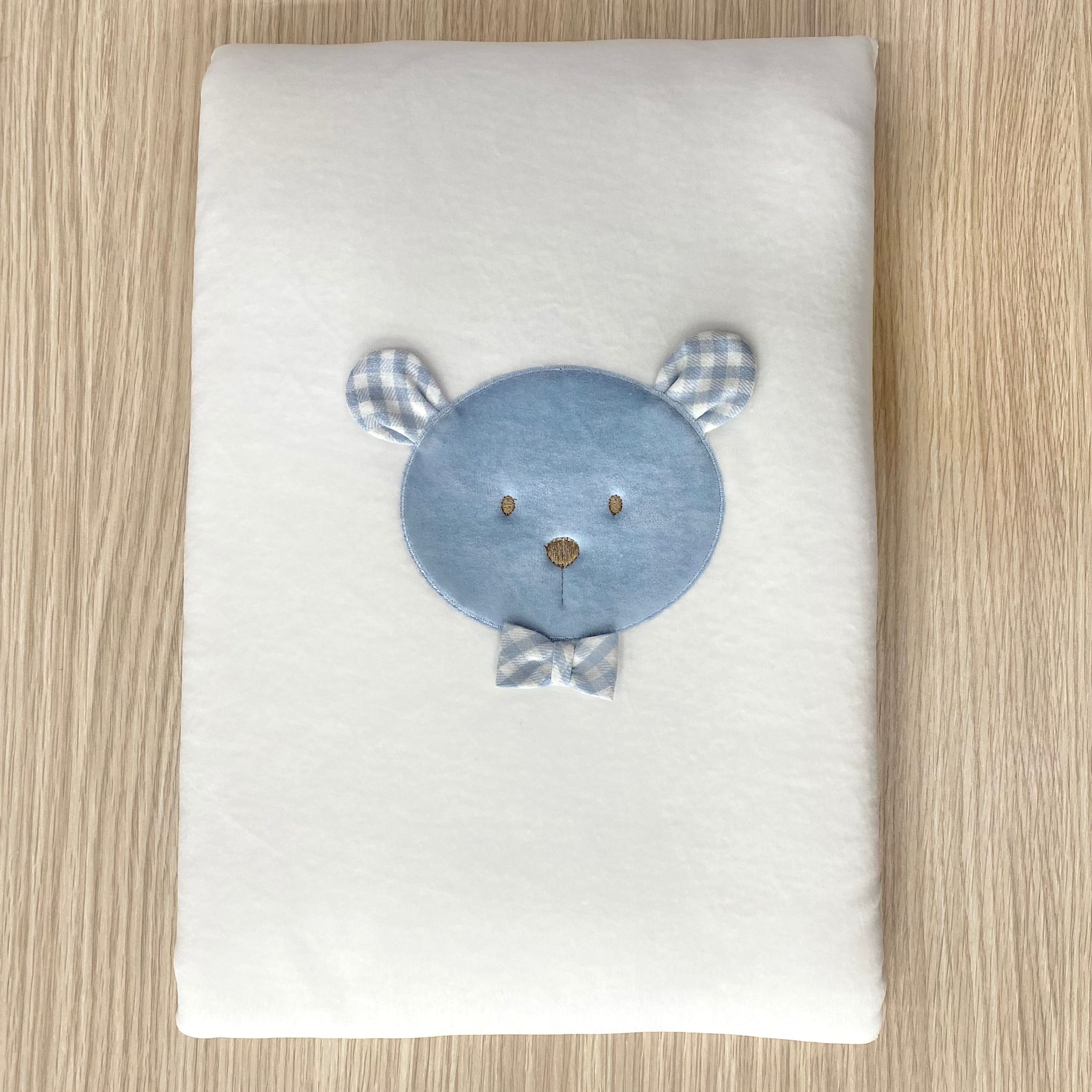 Copertina neonato in ciniglia di colore panna e azzurrino/polvere, con disegno in rilievo.