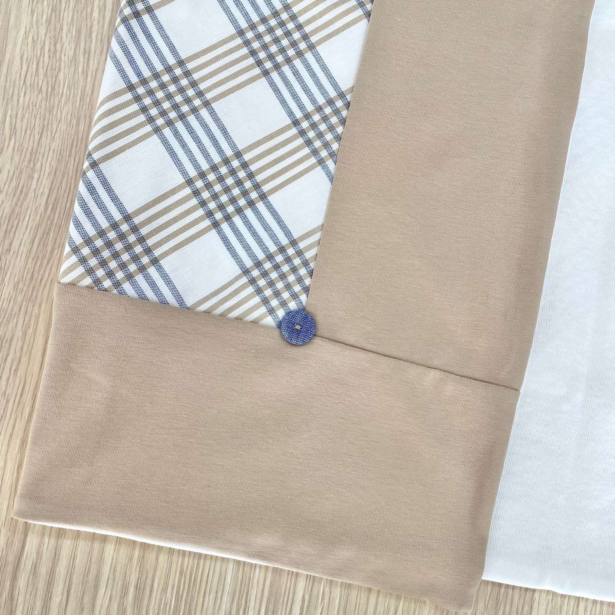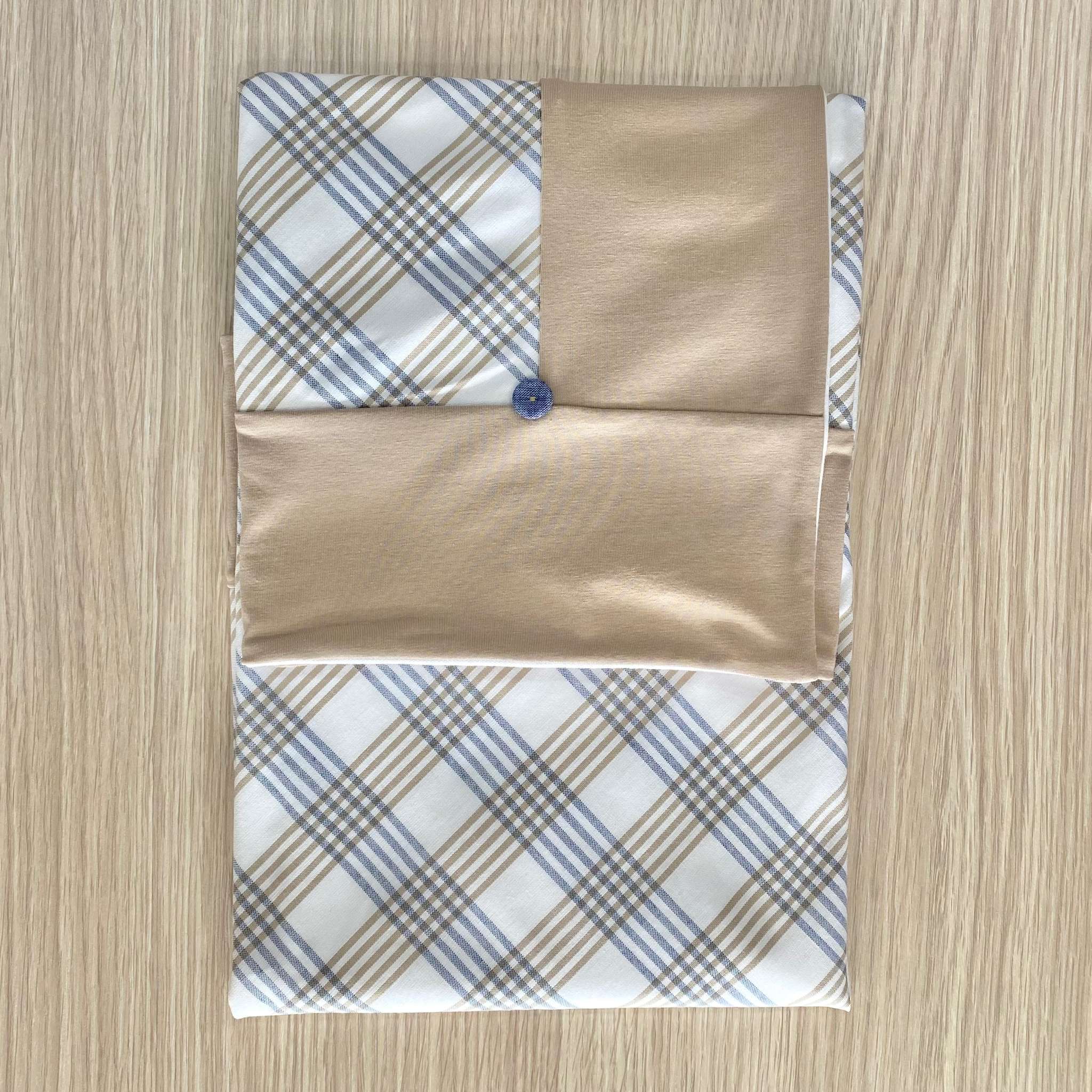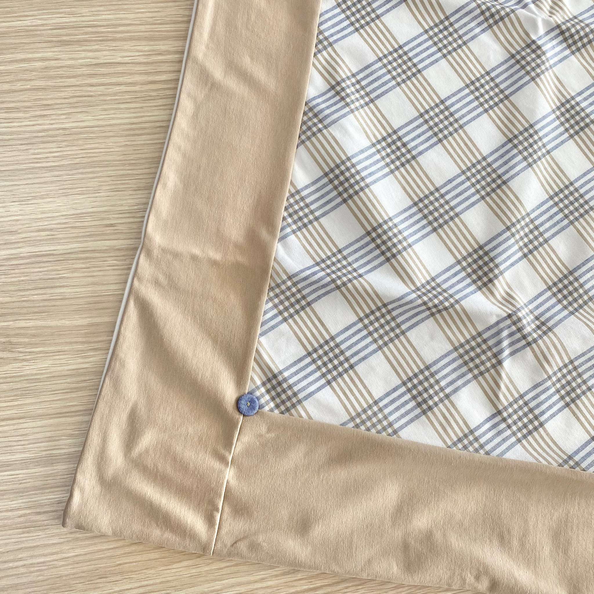 Copertina neonato in cotone, di colore bianco, nocciola e blu, con applicazione di bottoncini.