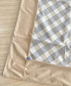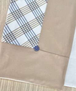 Copertina neonato in cotone, di colore bianco, nocciola e blu, con applicazione di bottoncini.