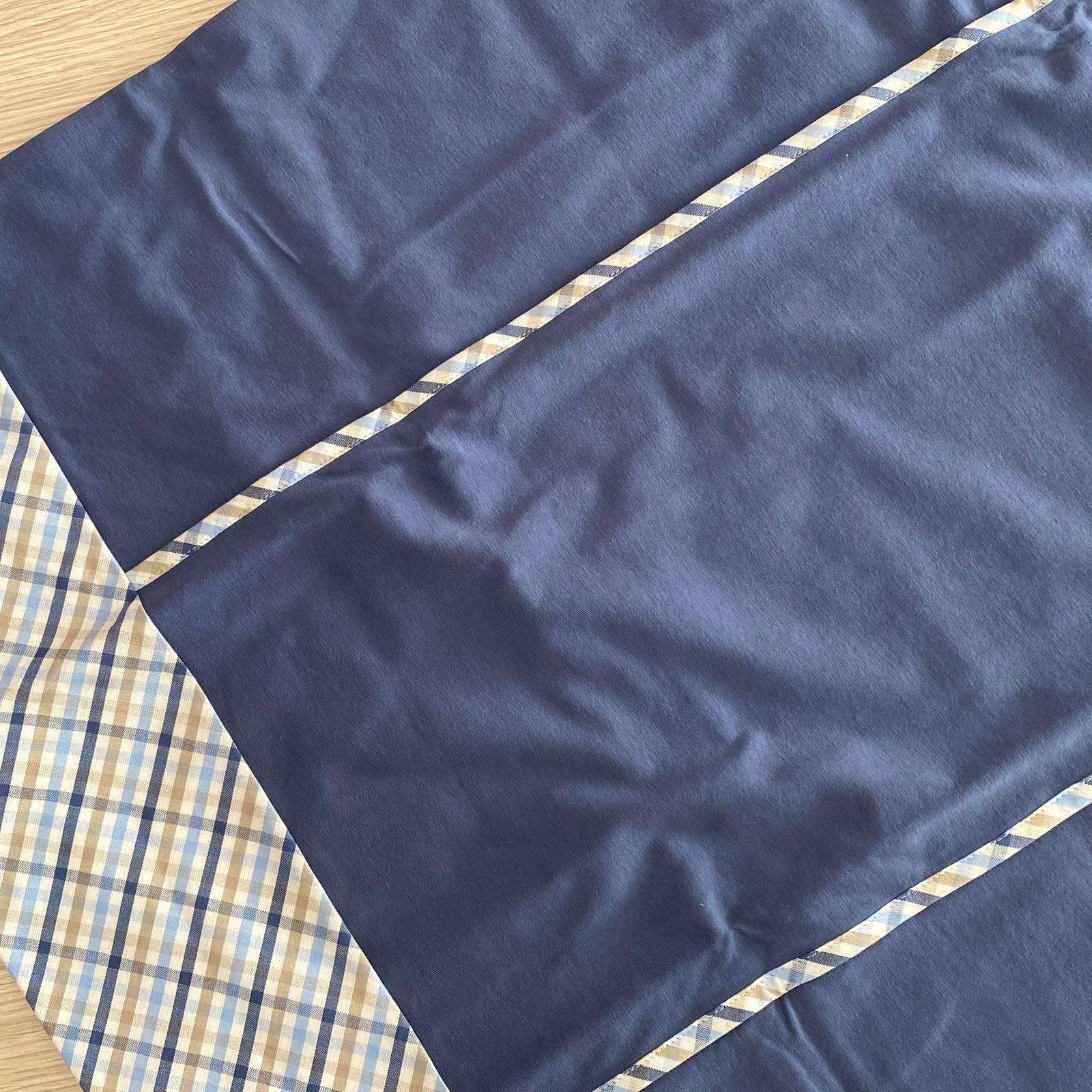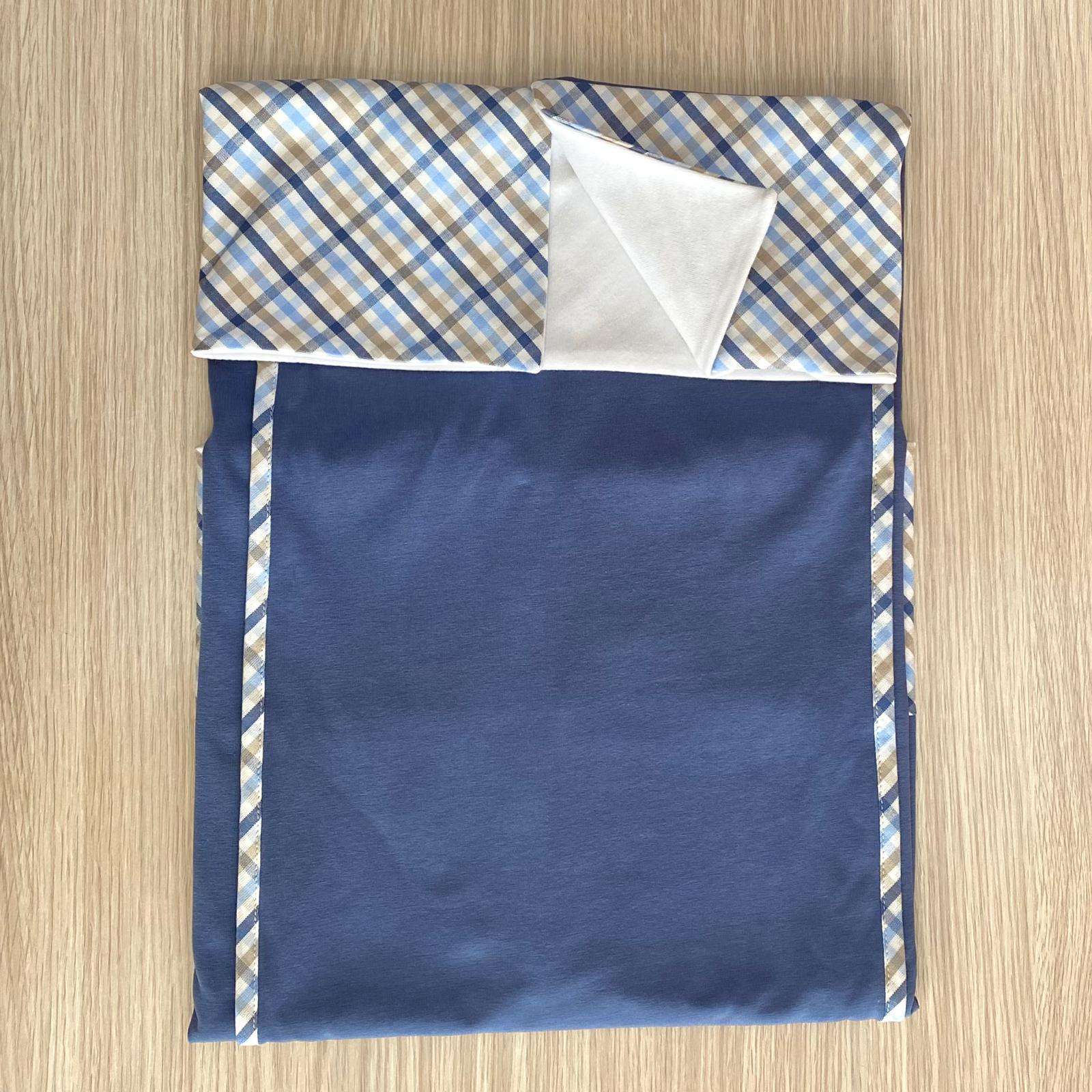 Copertina neonato in cotone, di colore bluette, con dettagli di colore beige e bianco.
