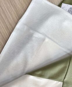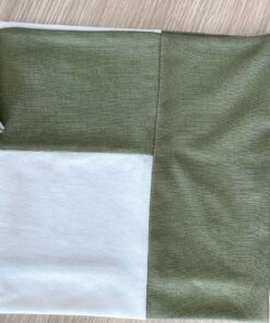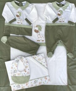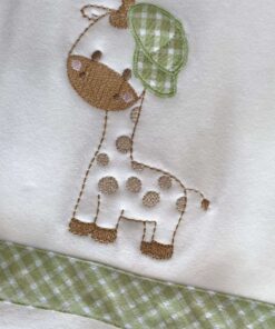 Copertina neonato in cotone, di colore panna e verde, con disegno tema safari di vari colori.