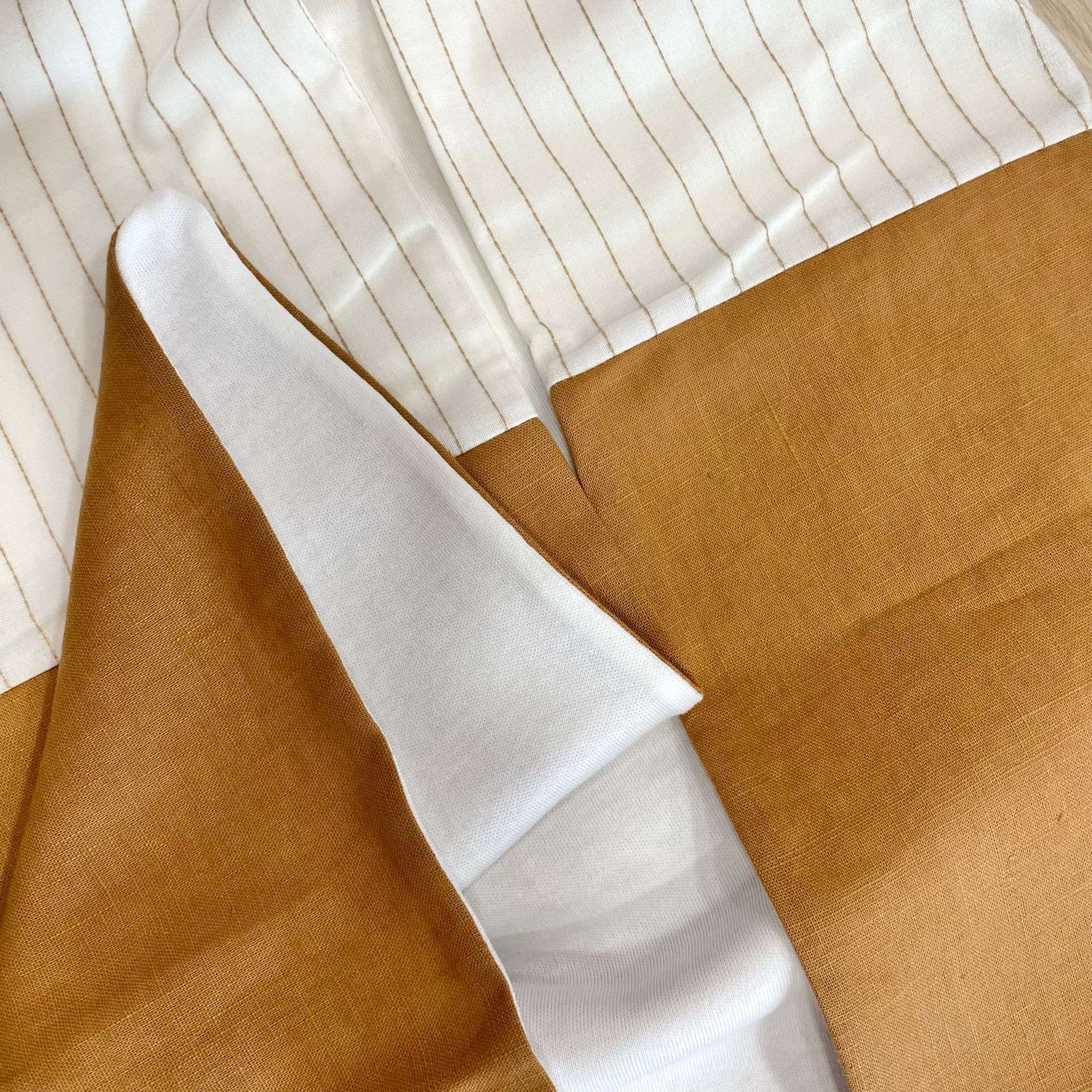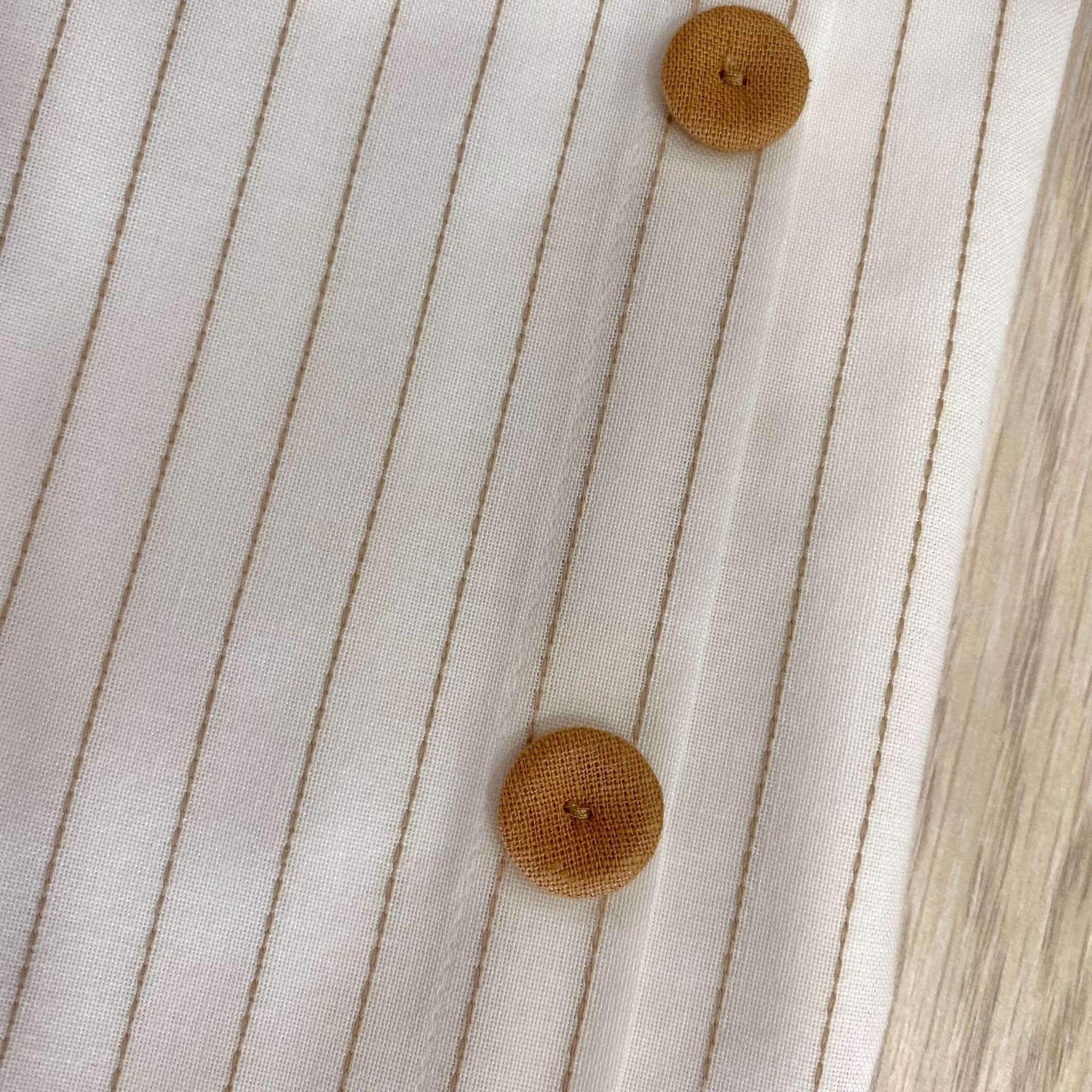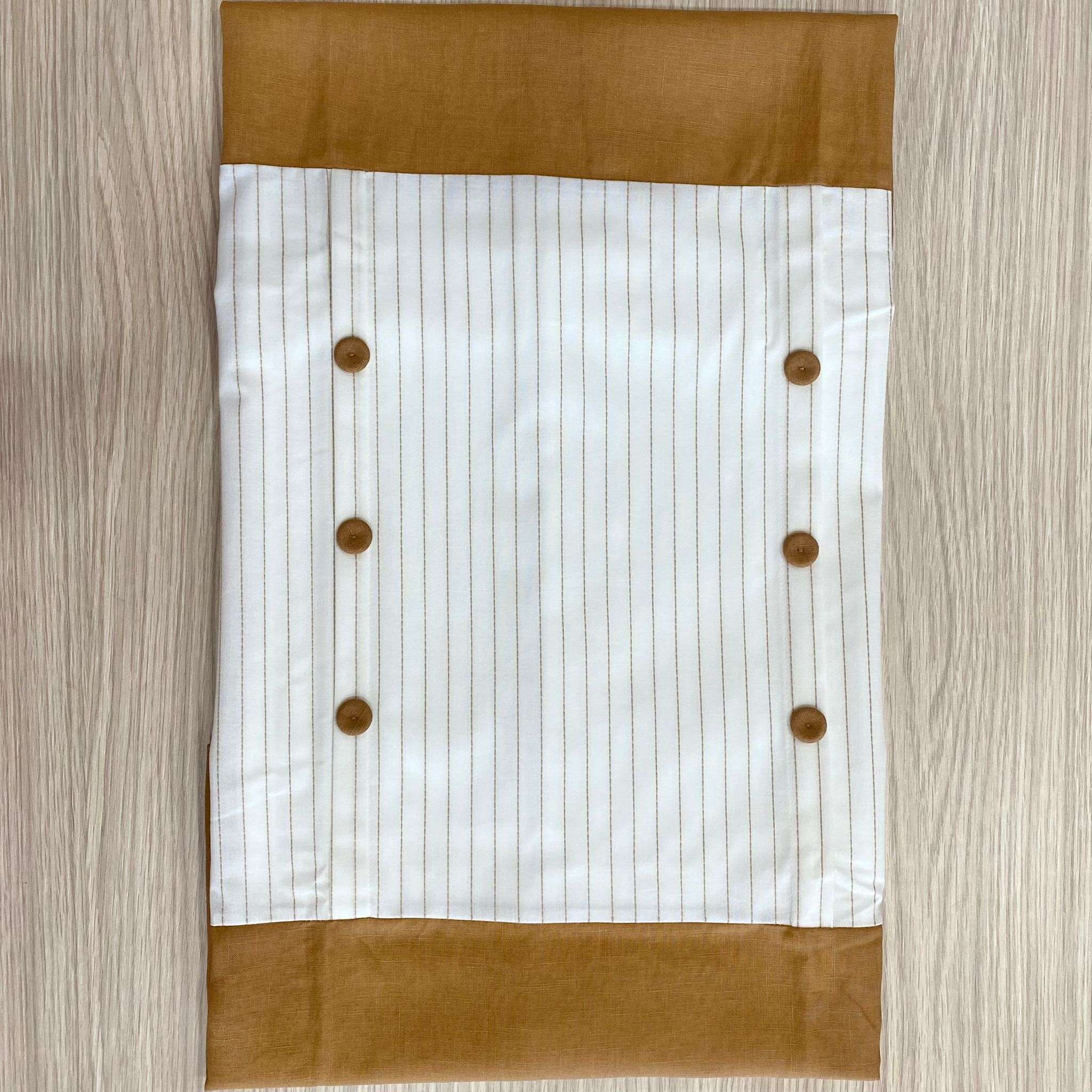 Copertina neonato in cotone misto lino, di colore panna e cammello, con bottoncini in rilievo.
