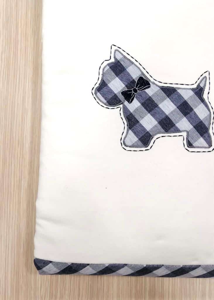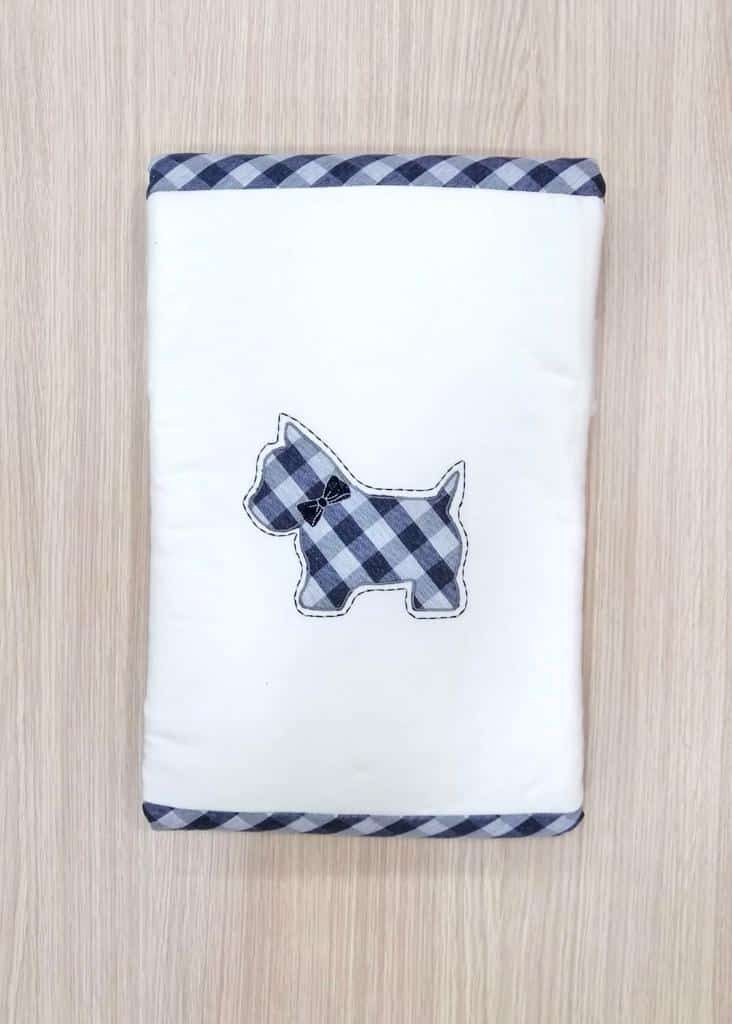 Copertina neonato, in caldo cotone e morbidissima imbottitura, di colore panna e con dettagli di colore blu.