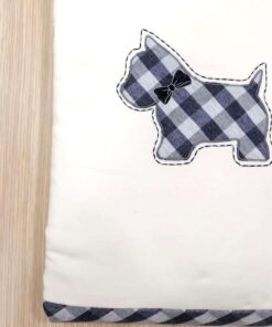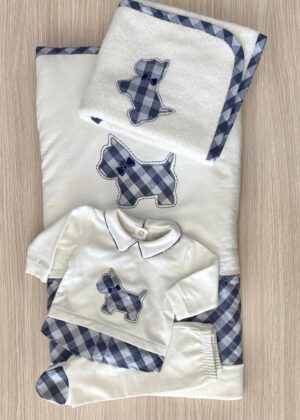 Copertina neonato, in caldo cotone e morbidissima imbottitura, di colore panna e con dettagli di colore blu.