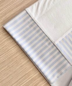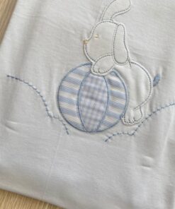 Copertina neonato in cotone di colore bianco e azzurro, con ricamo in rilievo e bordino effetto rigato.