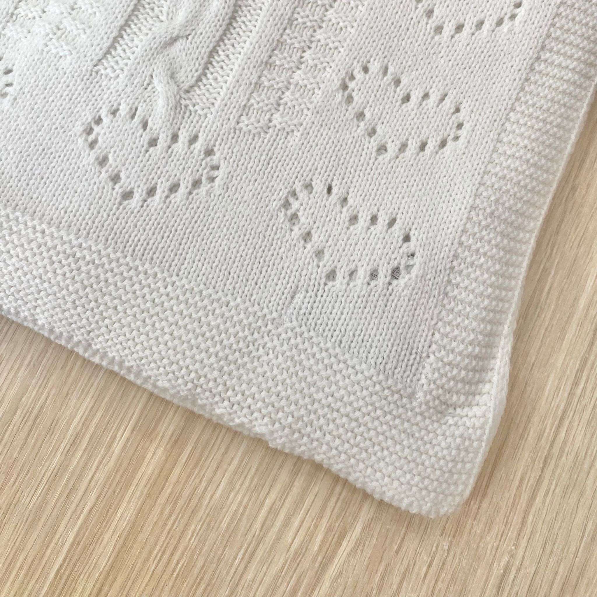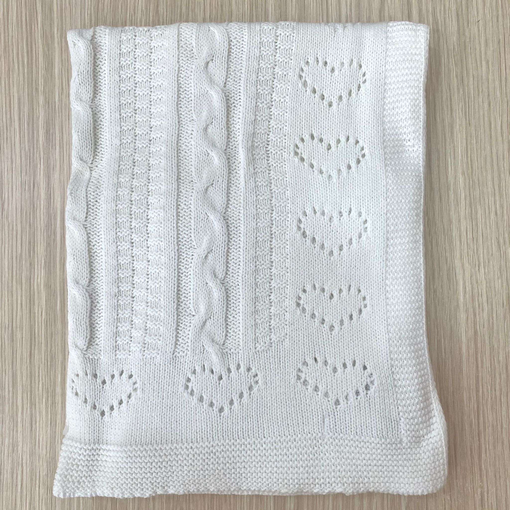 Copertina/scialletto culla/carrozzina neonato/o smacchinata in filo, di colore panna, con cuori traforati.