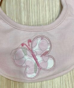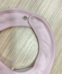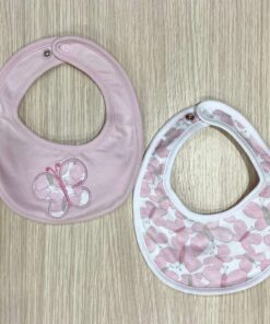 Coppia bavette neonata in spugna di cotone, di colore rosa e bianco, con disegno ricamato.