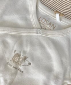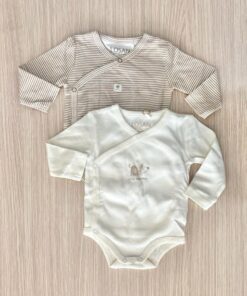Coppia body neonato/a in caldo cotone, di cotone organico, di colore beige e marroncino. Apertura laterale e nel cavallo con automatici. Con stampa sul petto di animale.