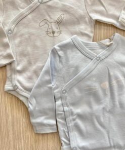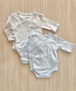 Coppia body neonato in caldo cotone, di cotone organico, di colore azzurro e bianco. Apertura laterale e nel cavallo con automatici. Con stampa sul petto di animale.