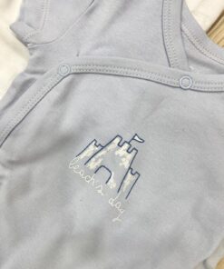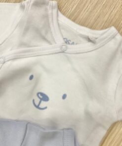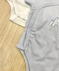 Coppia body mezza manica neonato in cotone organico, di colore bianco e celeste con stampa di colore blu e bianco. Apertura laterale e nel cavallo con automatici.