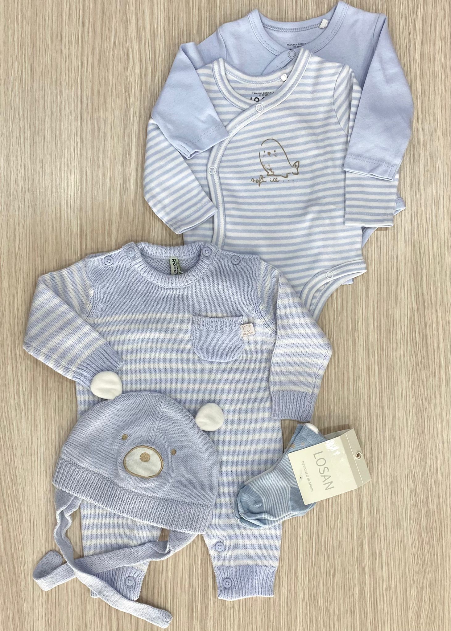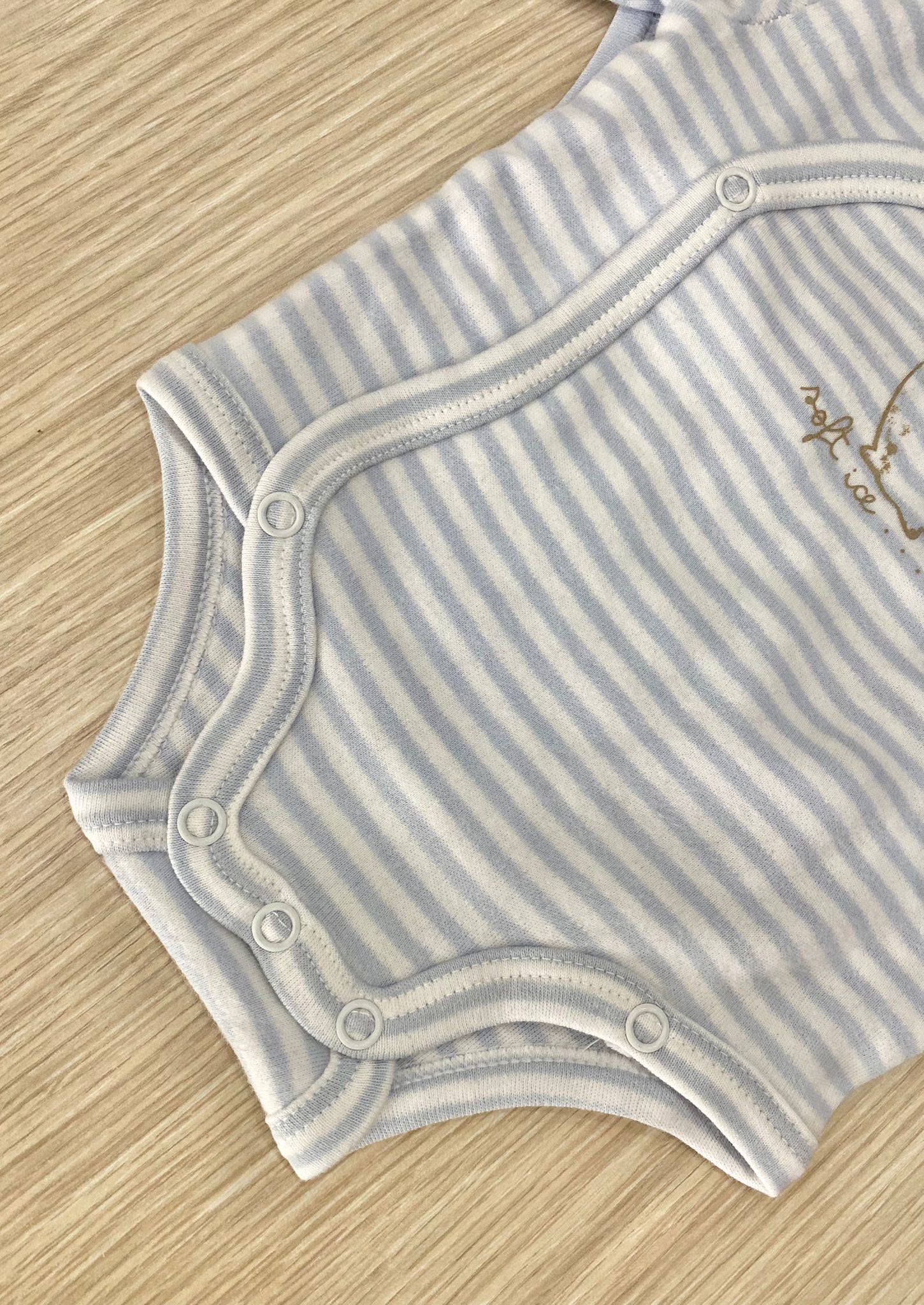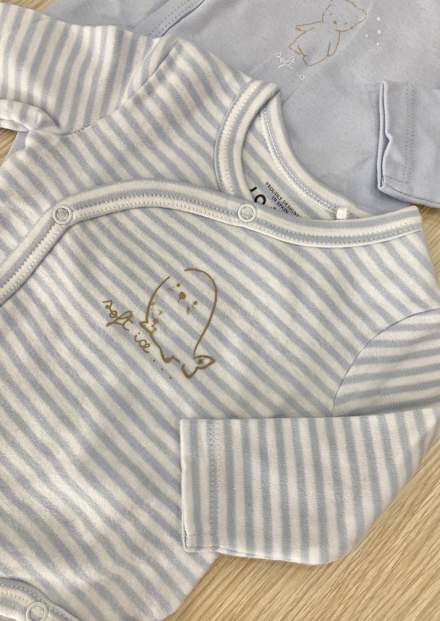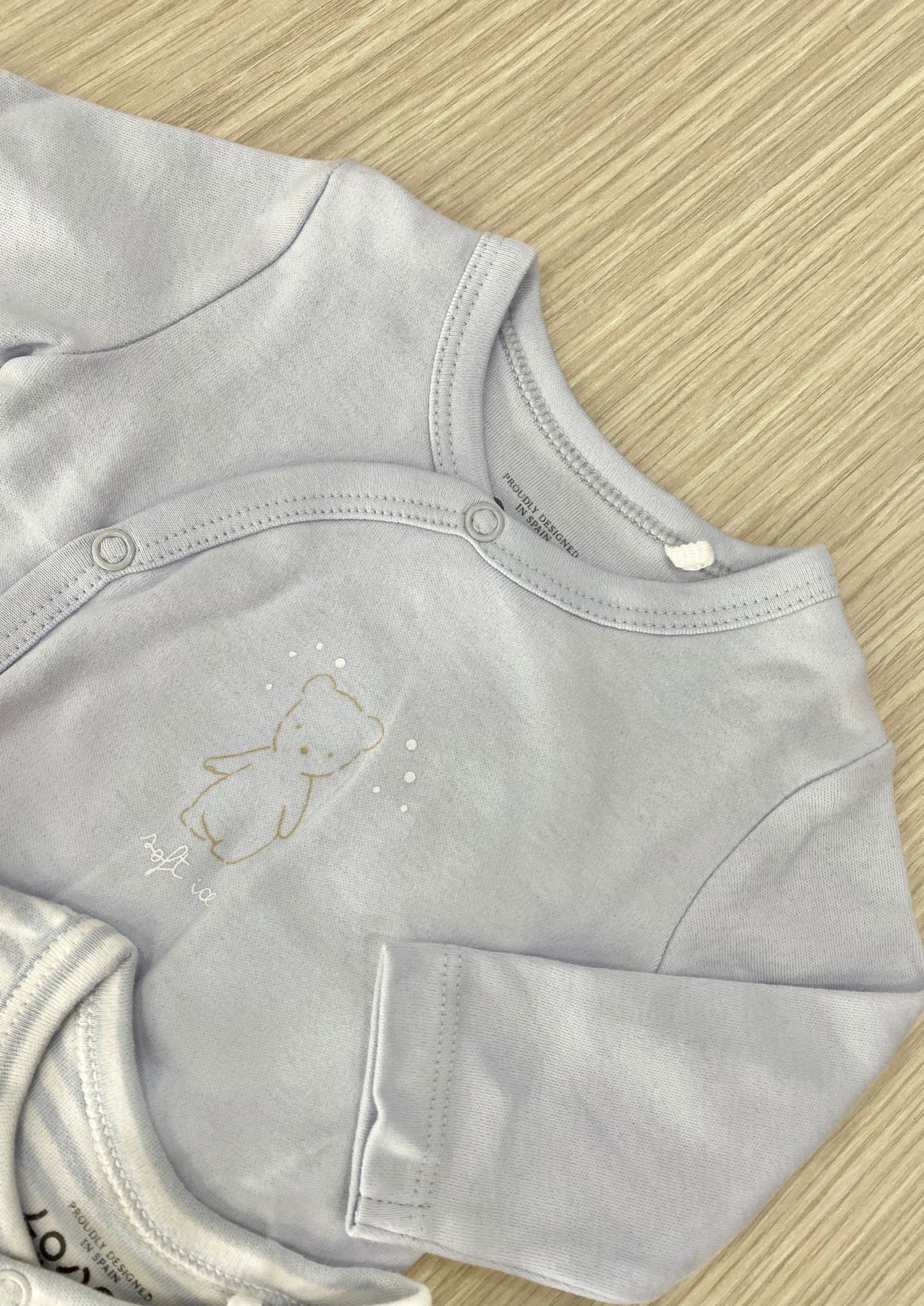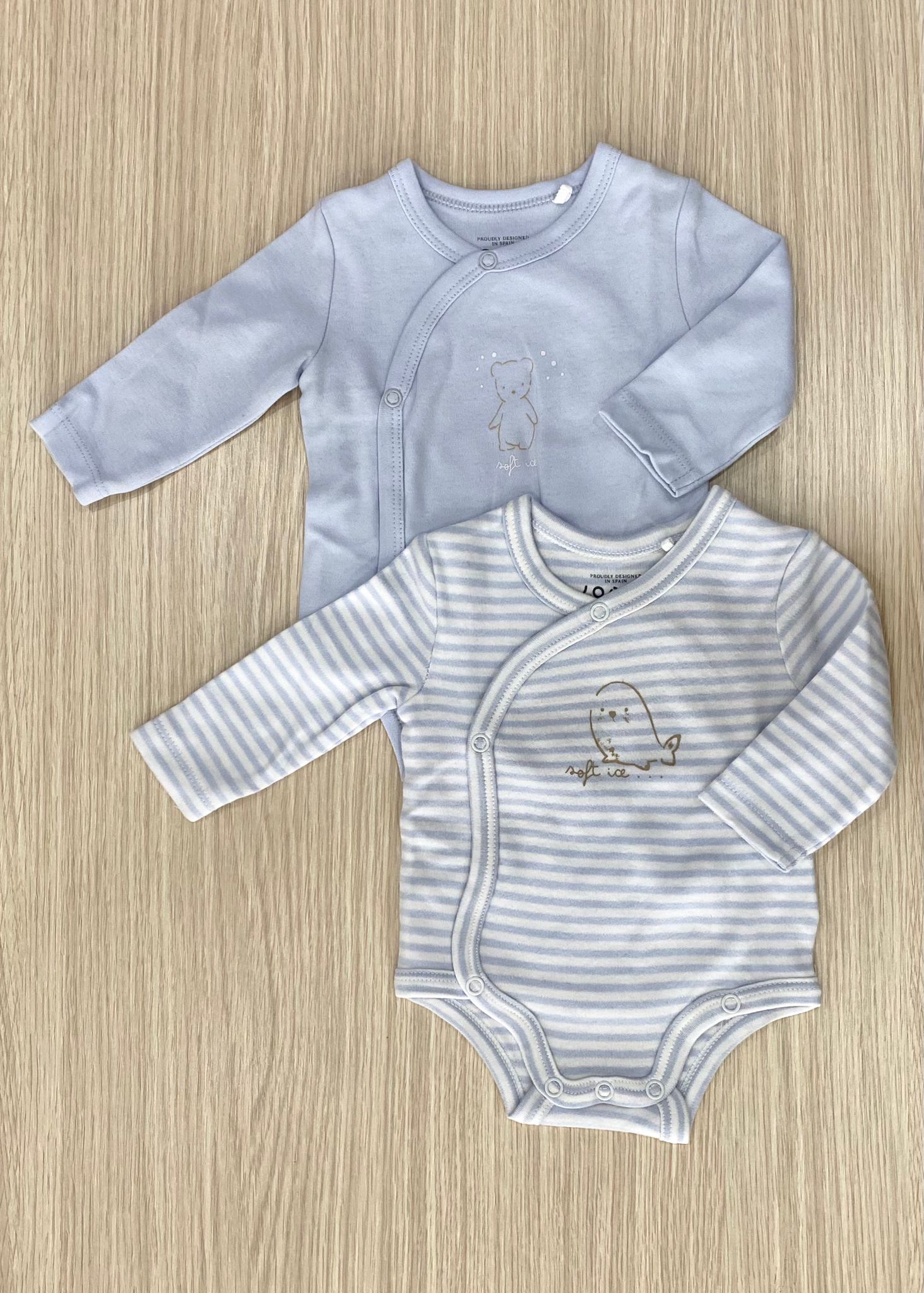 Coppia body neonato/bambino in caldo cotone, di colore di colore azzurro e bianco, con apertura incrocio all’americana.