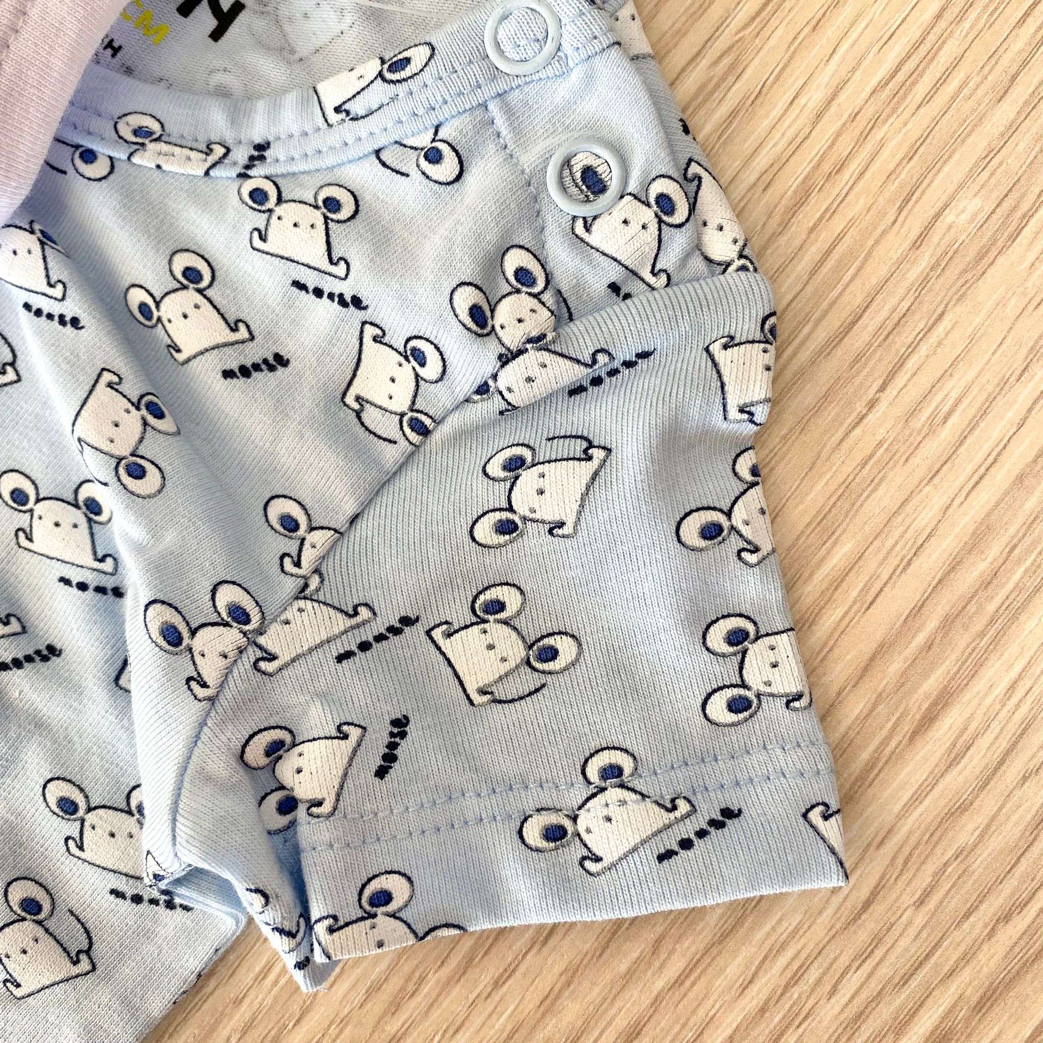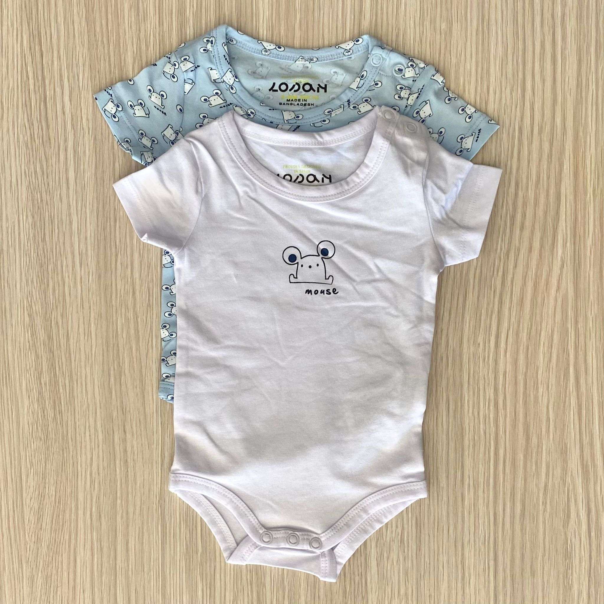 Coppia body neonato/bambino in cotone, di colore bianco e azzurro con disegno di vari colori.