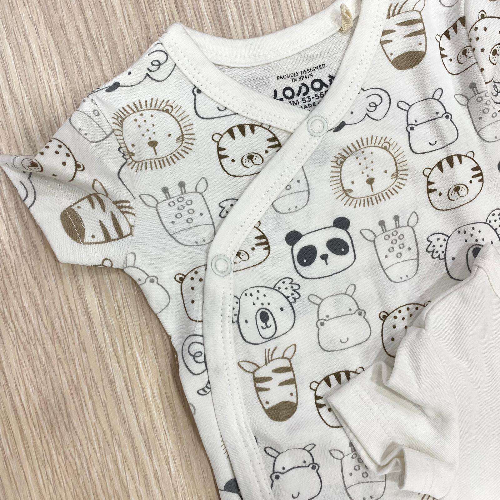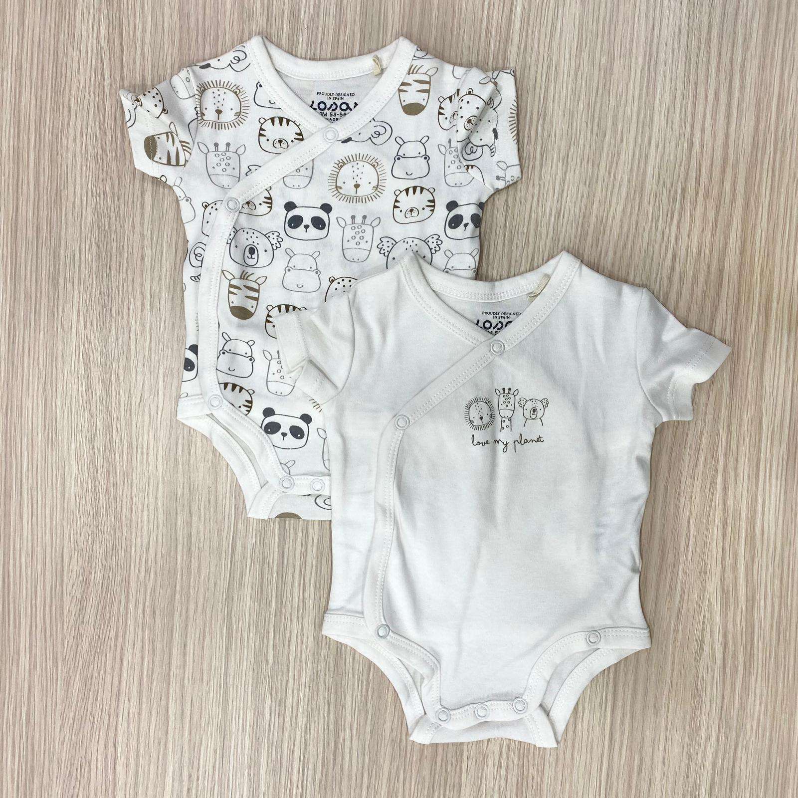 Coppia body neonato/a in caldo cotone, di colore panna con disegni di vari colori.