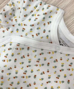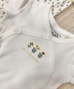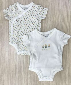 Coppia body neonata in caldo cotone, di colore panna con disegni di vari colori.
