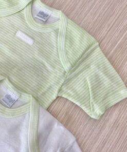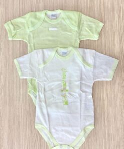 Coppia body neonato/a in cotone, di colore verde e bianco.