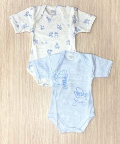 Coppia body neonato in morbido caldo cotone, leggermente felpato, di colore azzurro e bianco.