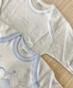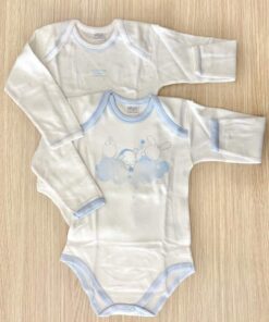 Coppia body neonato in morbido caldo cotone leggermente felpato, di colore azzurro e bianco.