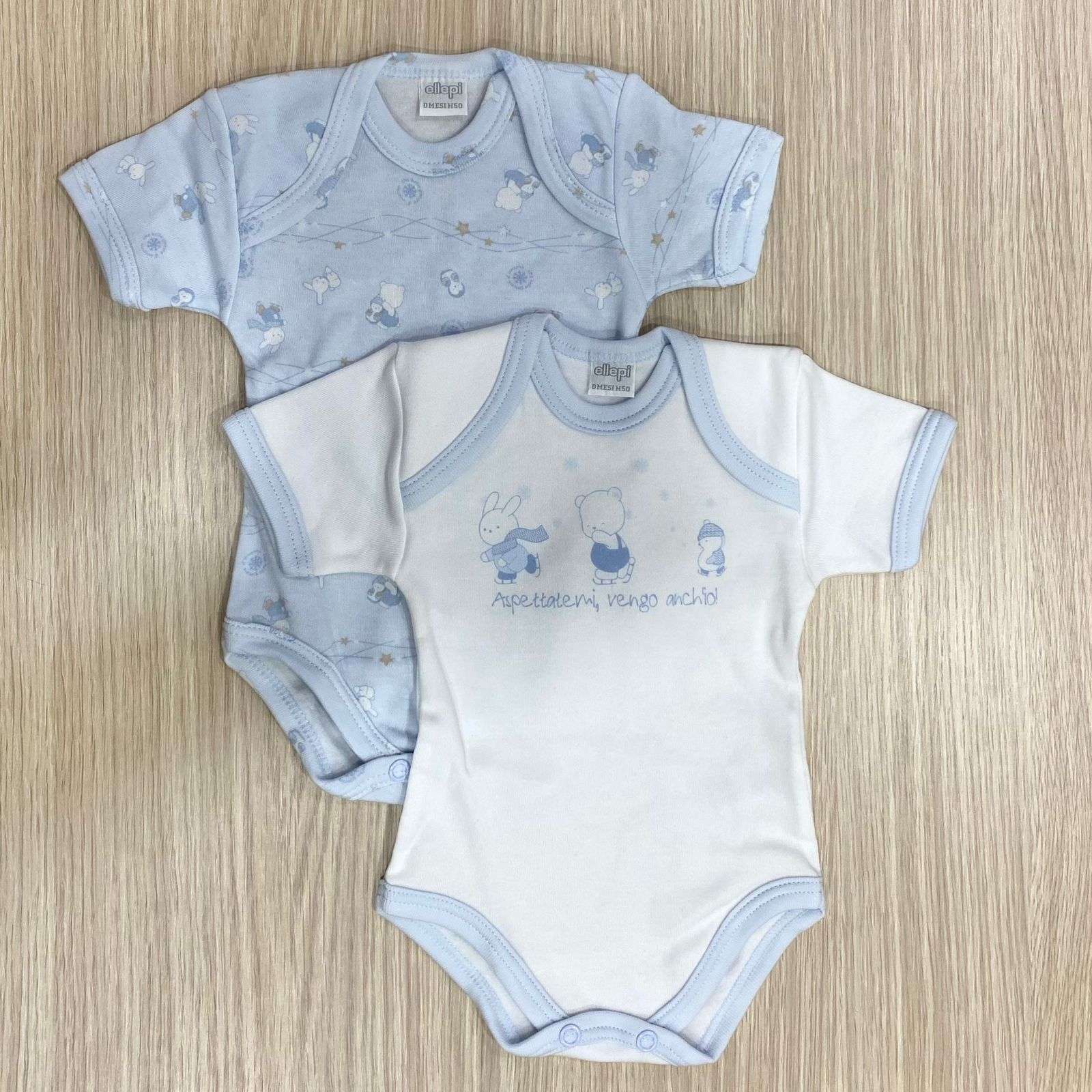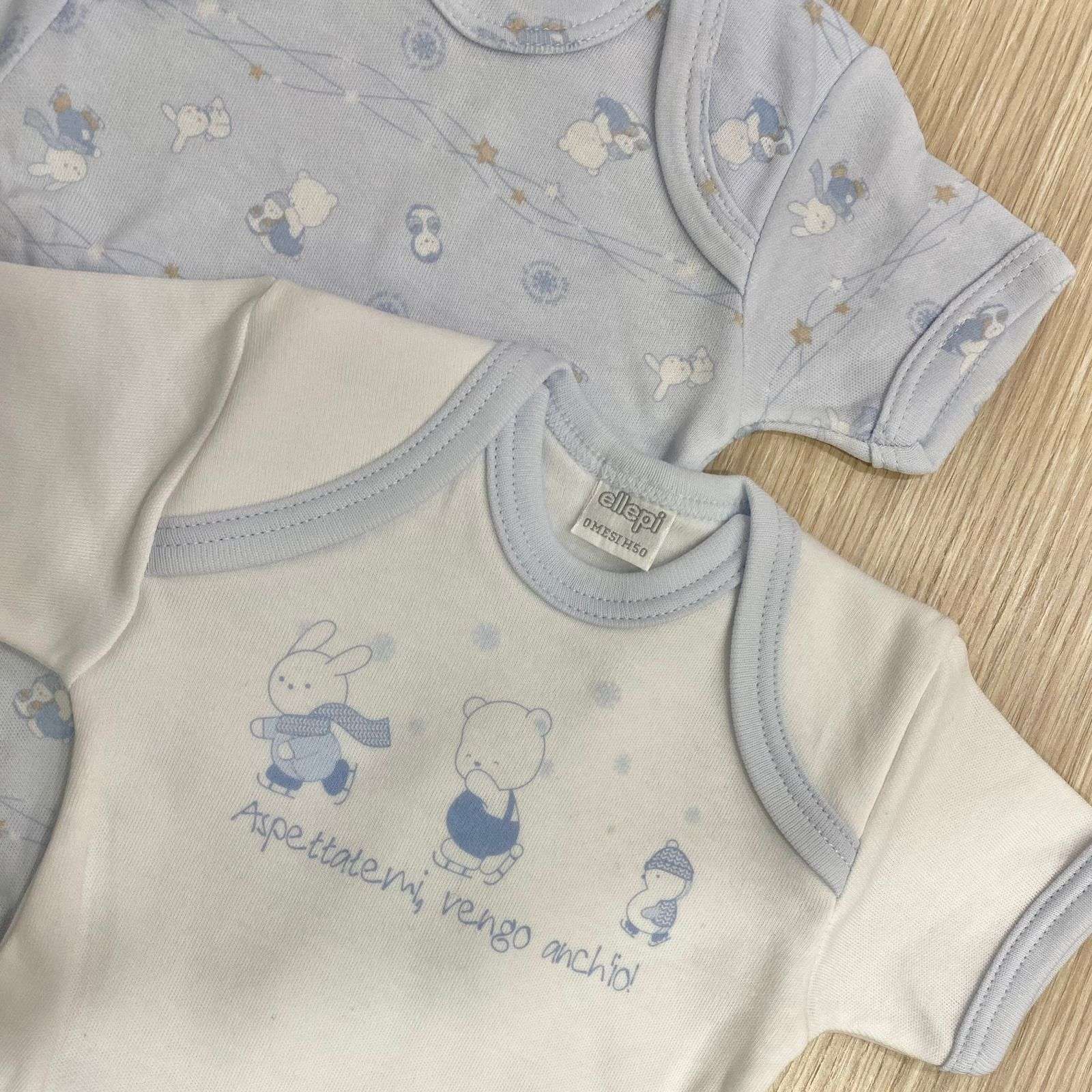 Coppia body neonato in caldo cotone leggermente felpato, di colore bianco e azzurro.