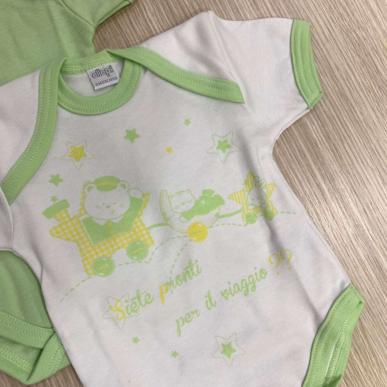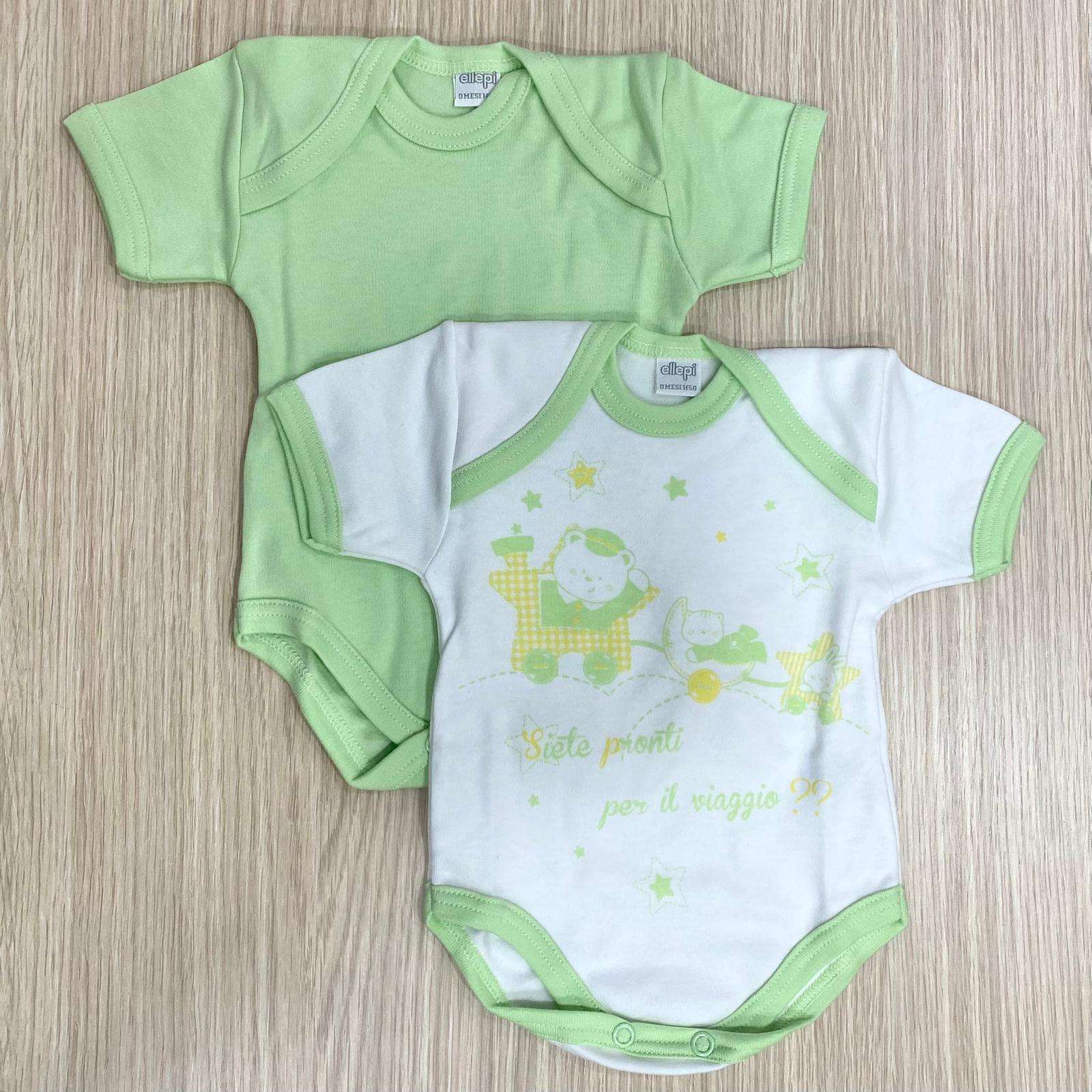Coppia body neonato/a in caldo cotone leggermente felpato, di colore bianco e verde.