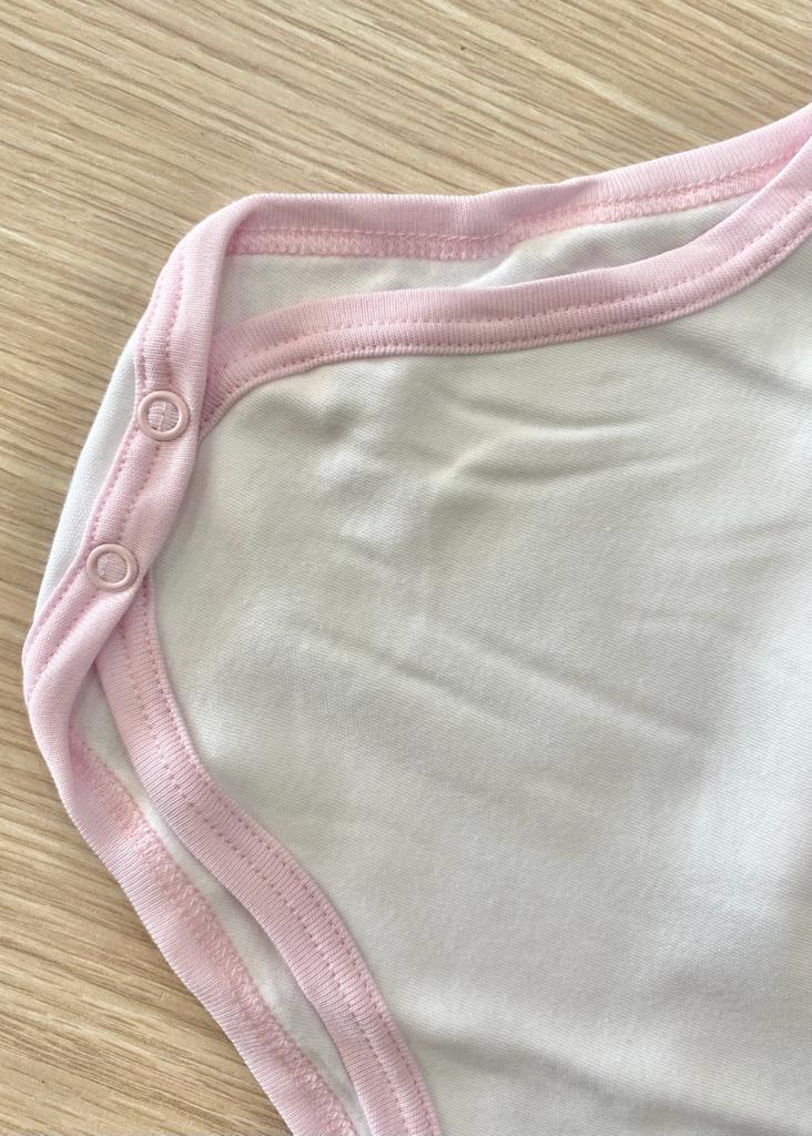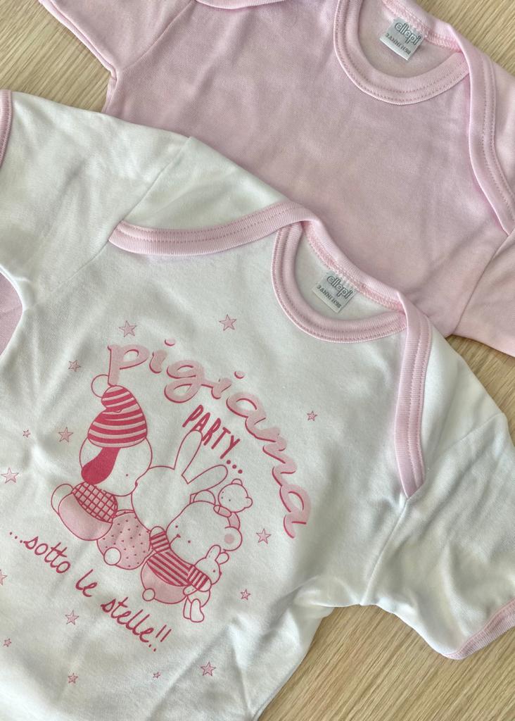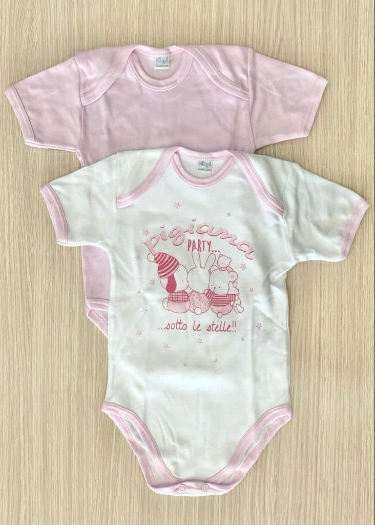 Coppia body neonata in morbido caldo cotone leggermente felpato, di colore bianco e rosa.