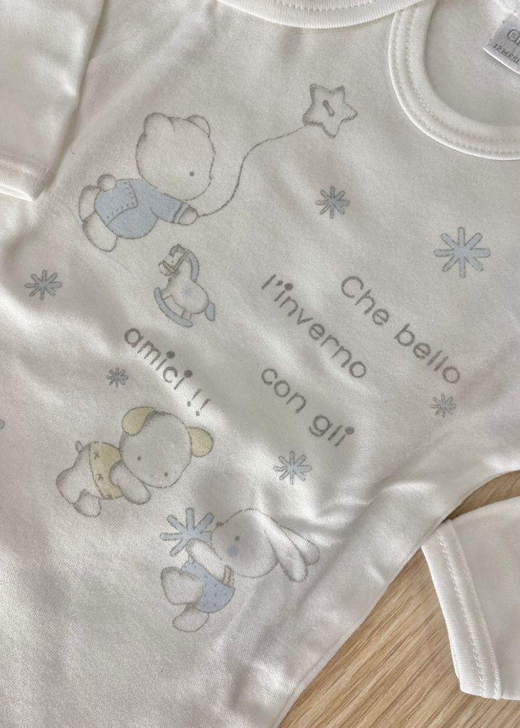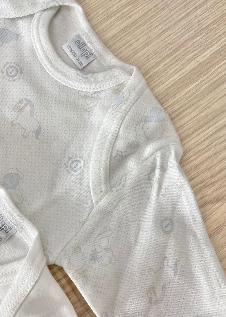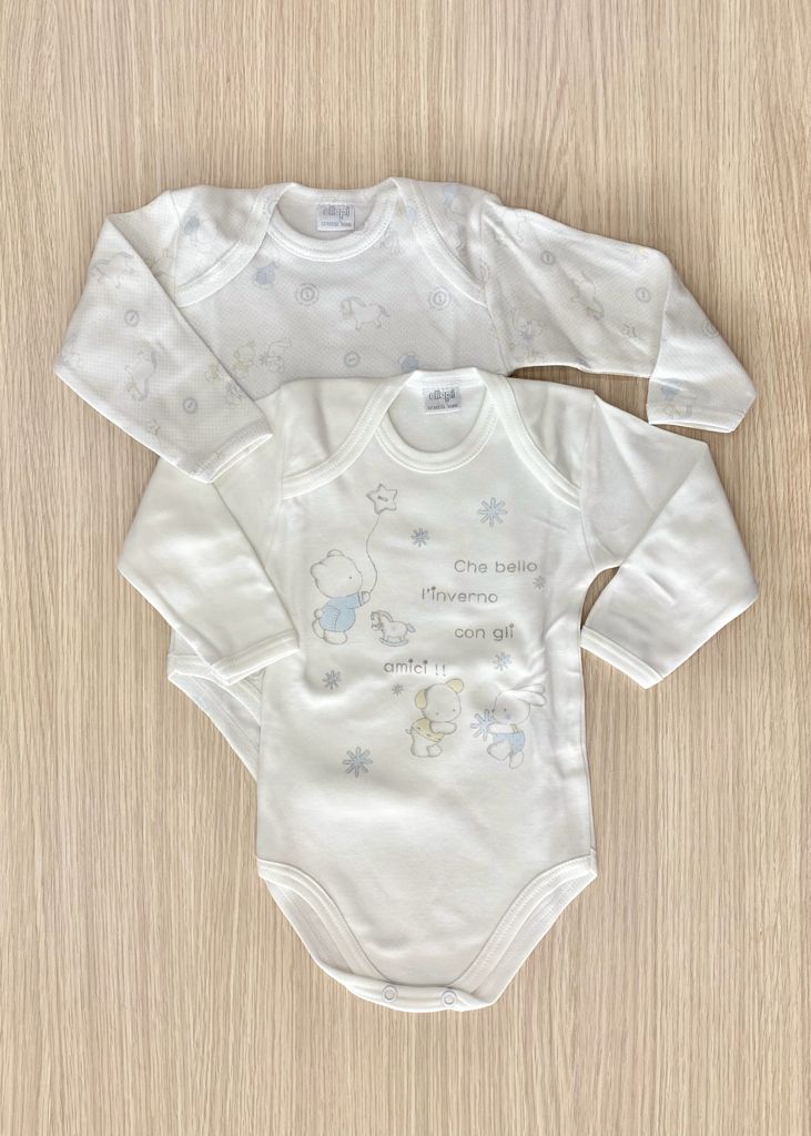 Coppia body bambino in caldo cotone, leggermente felpato, di colore bianco e azzurro.