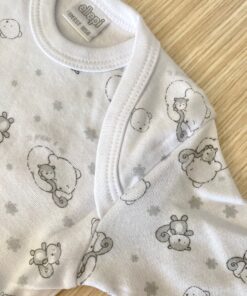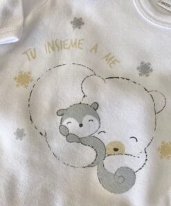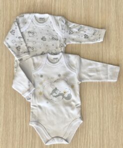 Coppia body neonato/a/bambino/a in caldo cotone leggermente felpato, di colore grigio e bianco.