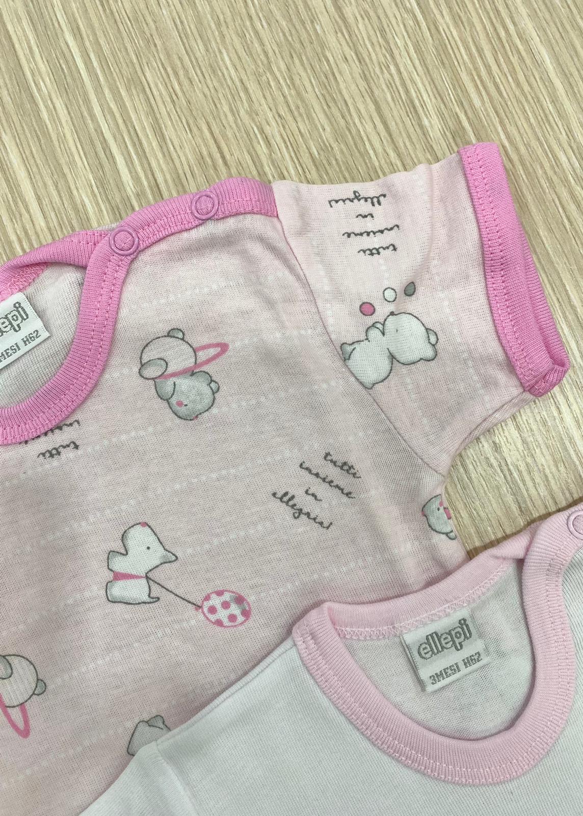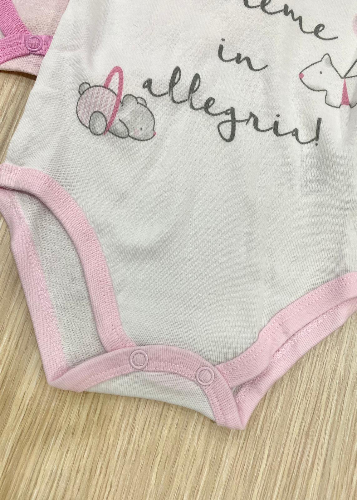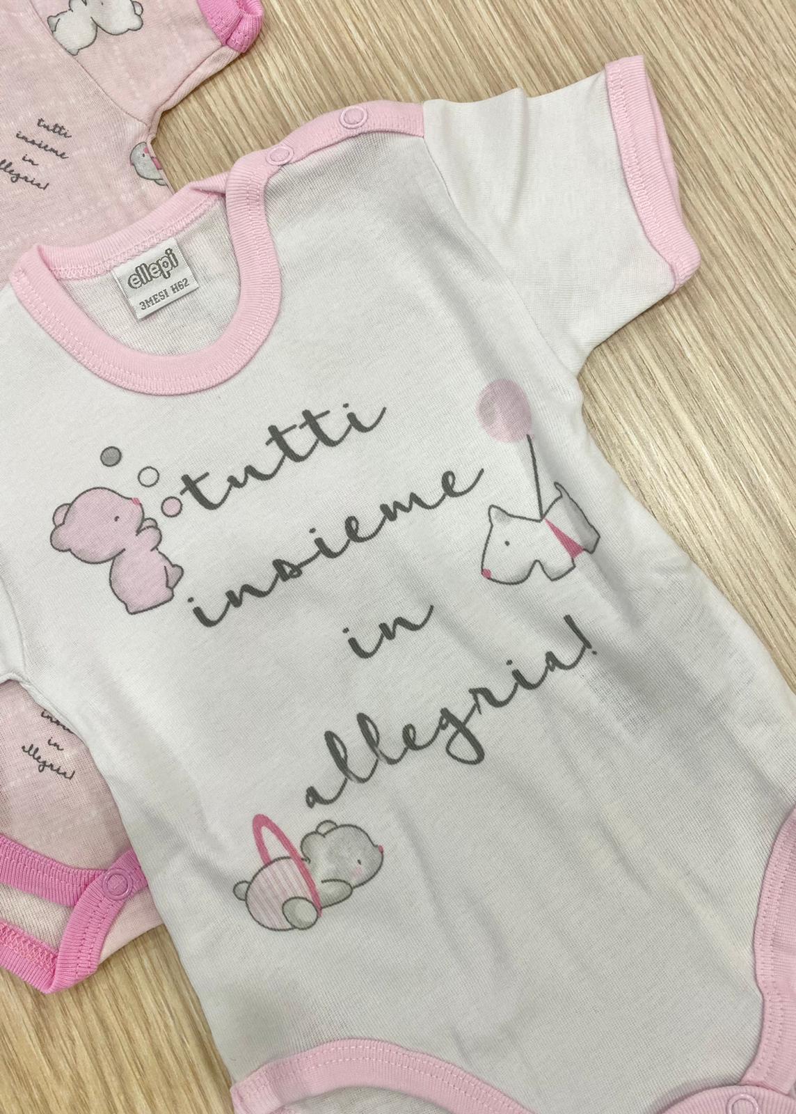 Coppia body mezza manica neonata/bambina in cotone, di colore bianco e rosa, con dettagli di vari colori.