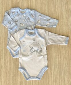 Coppia body neonato/bambino in caldo cotone leggermente felpato, di colore azzurro e bianco.