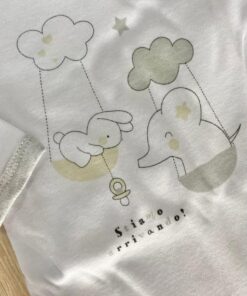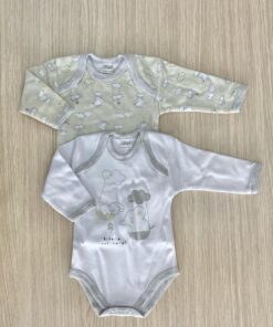 Coppia body neonato/a in caldo cotone, leggermente felpato, di colore bianco, grigio e beige.