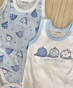 Coppia body neonato/bambino in cotone, di colore azzurro e bianco.