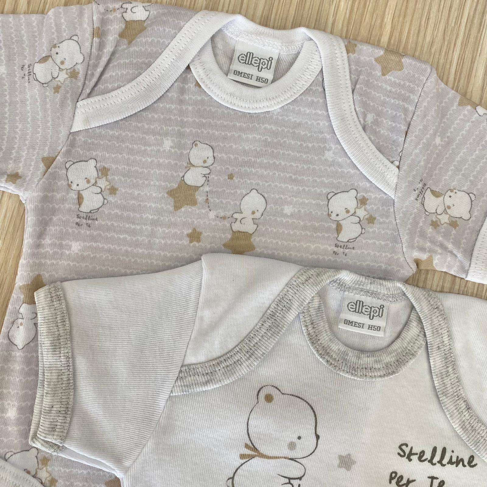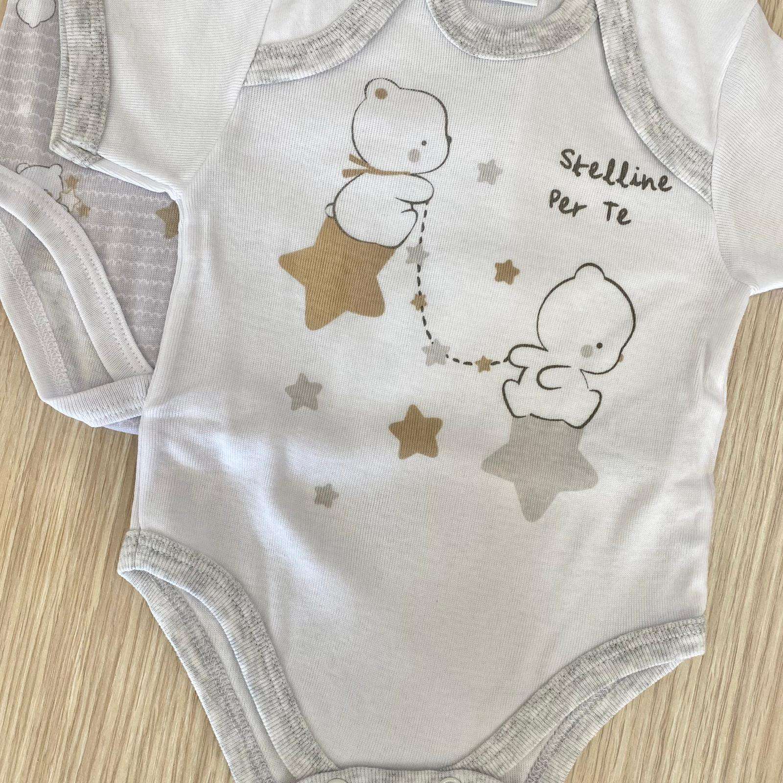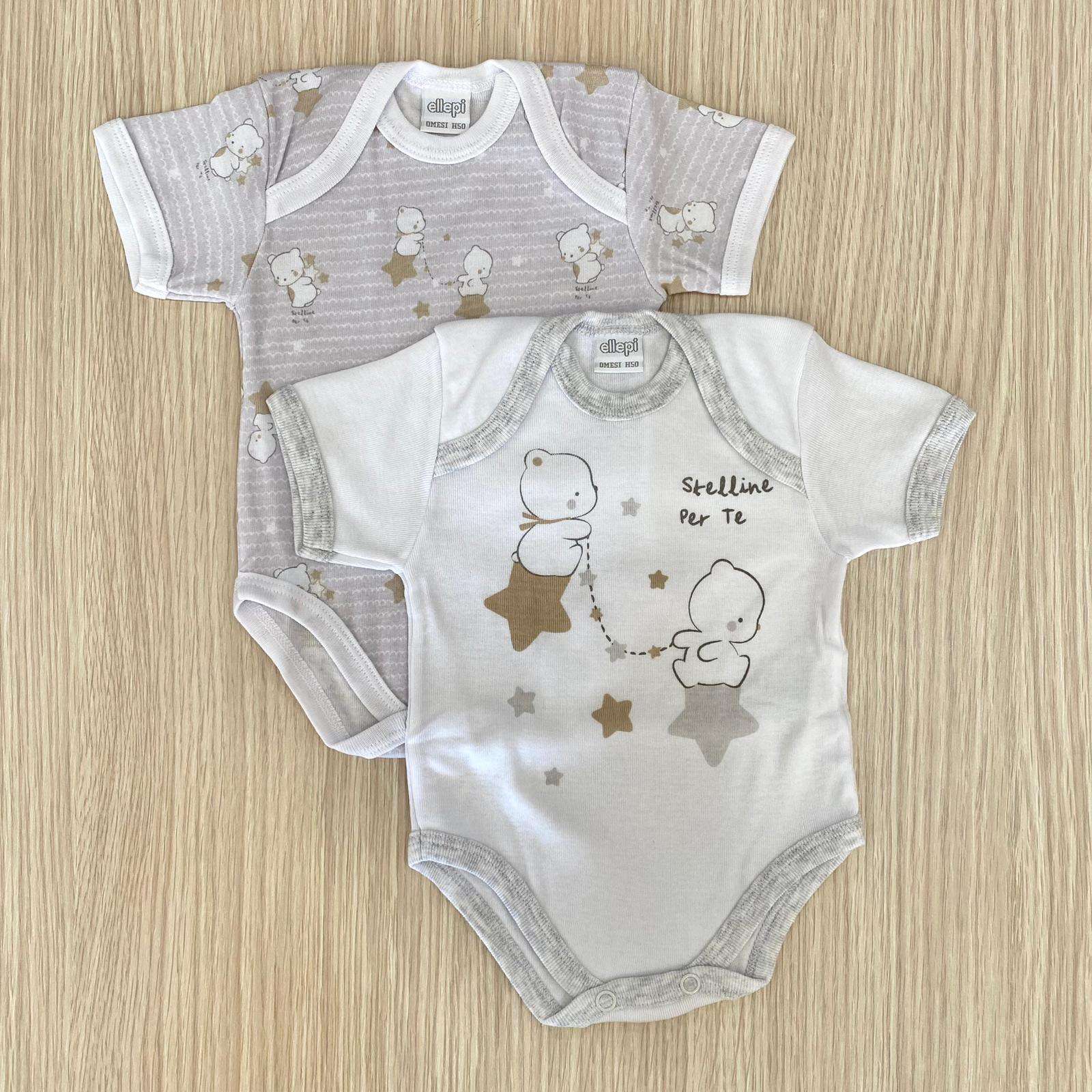 Coppia body neonato/a/bambino/a in cotone, di colore grigio e bianco.