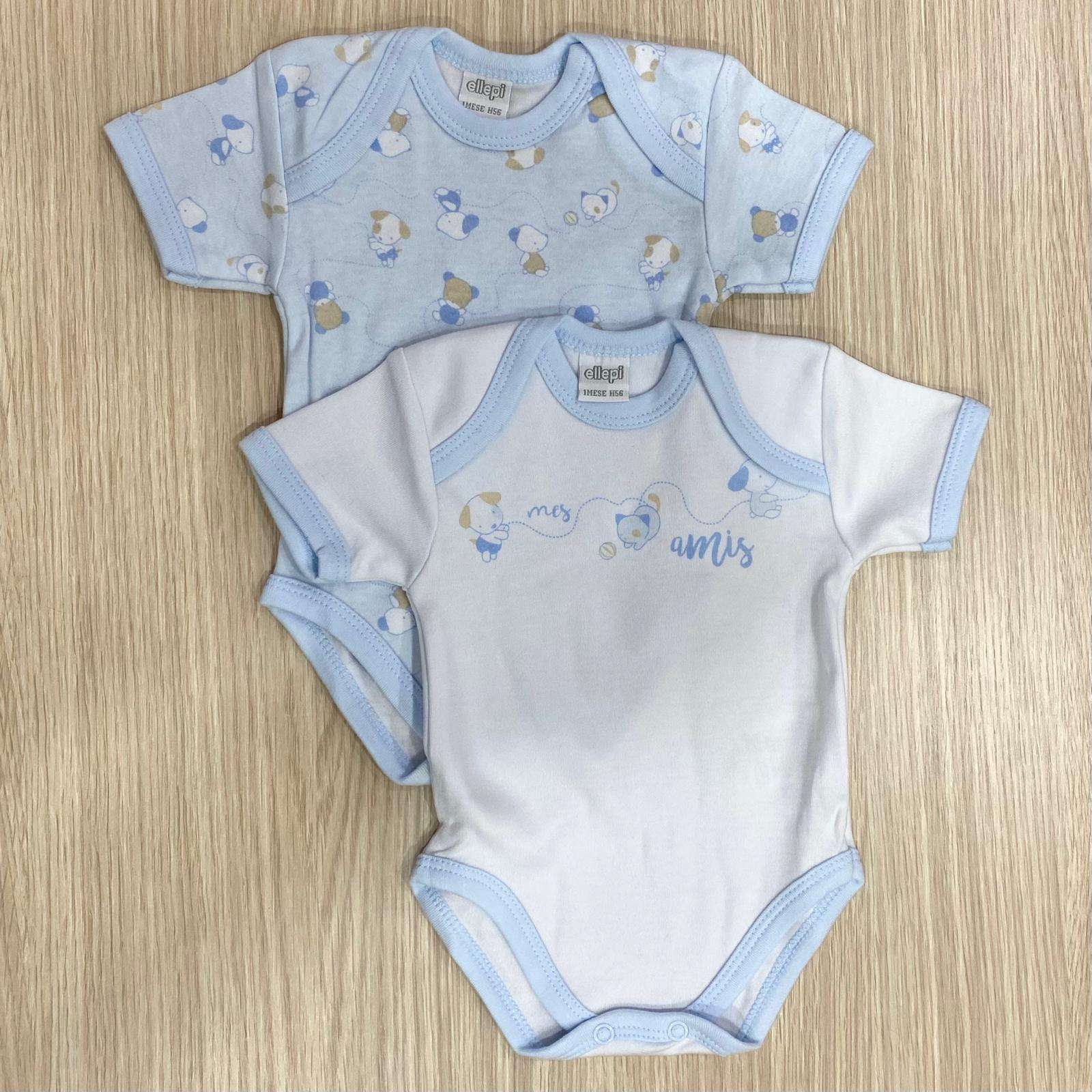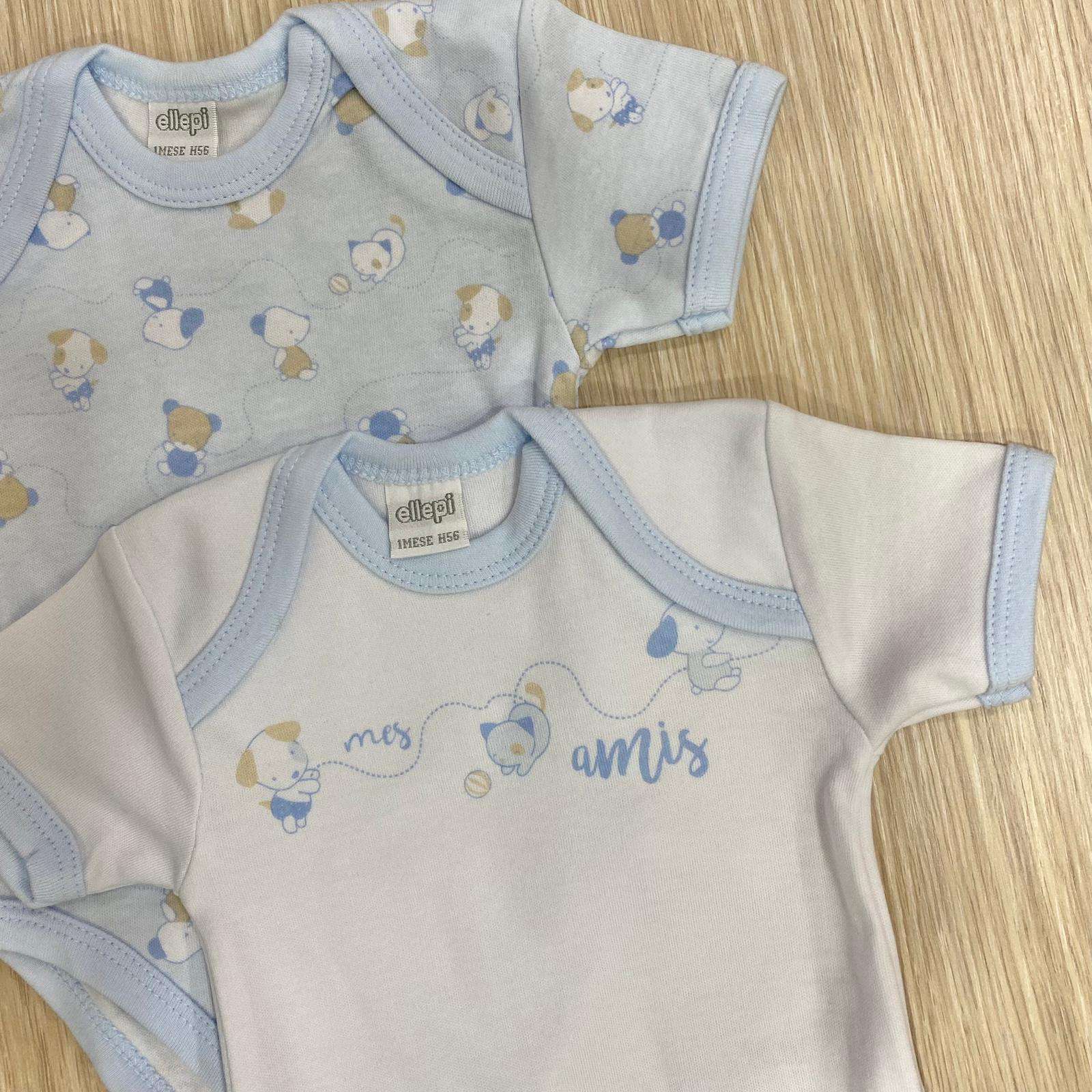 Coppia body neonato in caldo cotone leggermente felpato, di colore azzurro e bianco.