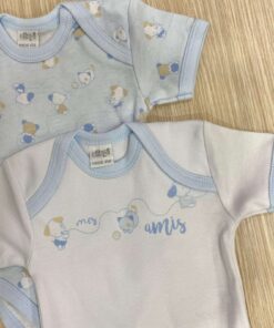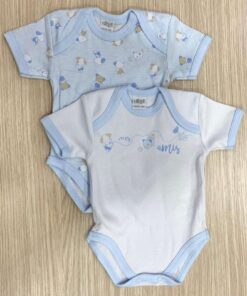 Coppia body neonato in caldo cotone leggermente felpato, di colore azzurro e bianco.
