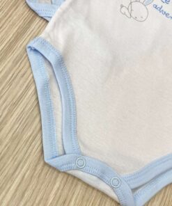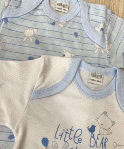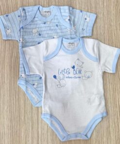 Coppia body mezza manica neonato/bambino in cotone, di colore bianco e azzurro, con dettagli di vari colori.